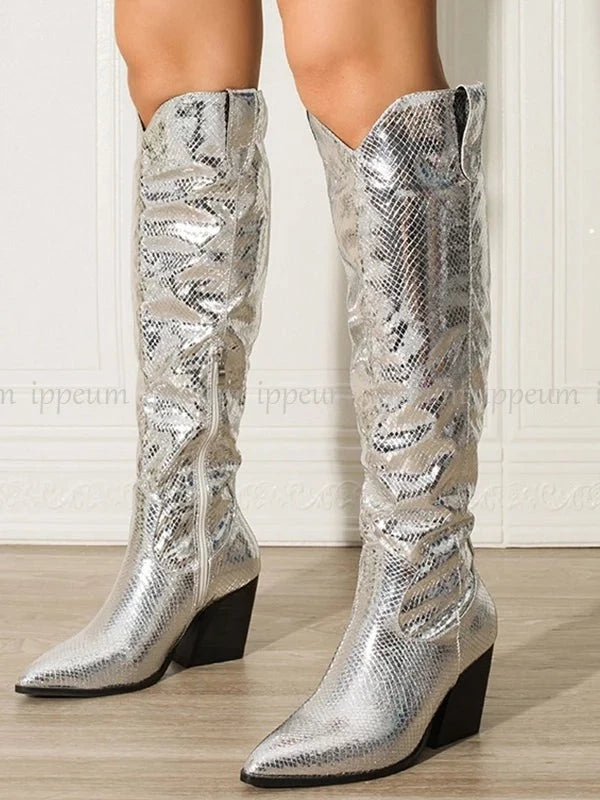 Metallic Silver Women Chelsea Boots Chunky High Heel Pointed Toe Knee High Shoes Western Cowboy Boots