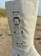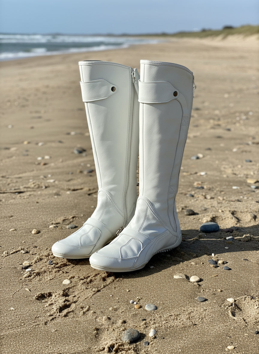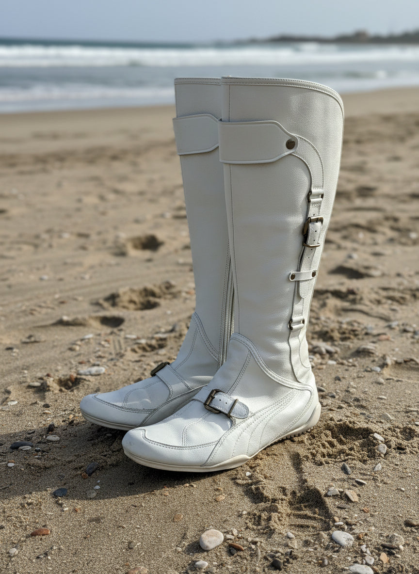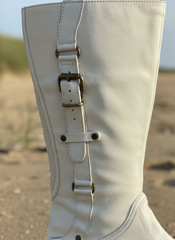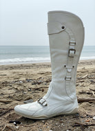 women’s flat boots features a sleek, modern design crafted in soft white leather. The boots rise up to the knee and have a sporty yet stylish look, blending the silhouette of a tall boot with the comfort and flexibility of a sneaker. Decorative straps and metal buckles accent the sides, adding visual interest without compromising comfort. The soles are flat with a lightly textured tread, designed for easy walking and everyday wear. Overall, they combine fashion and practicality, offering a chic, comfortable option for casual or urban outfits.