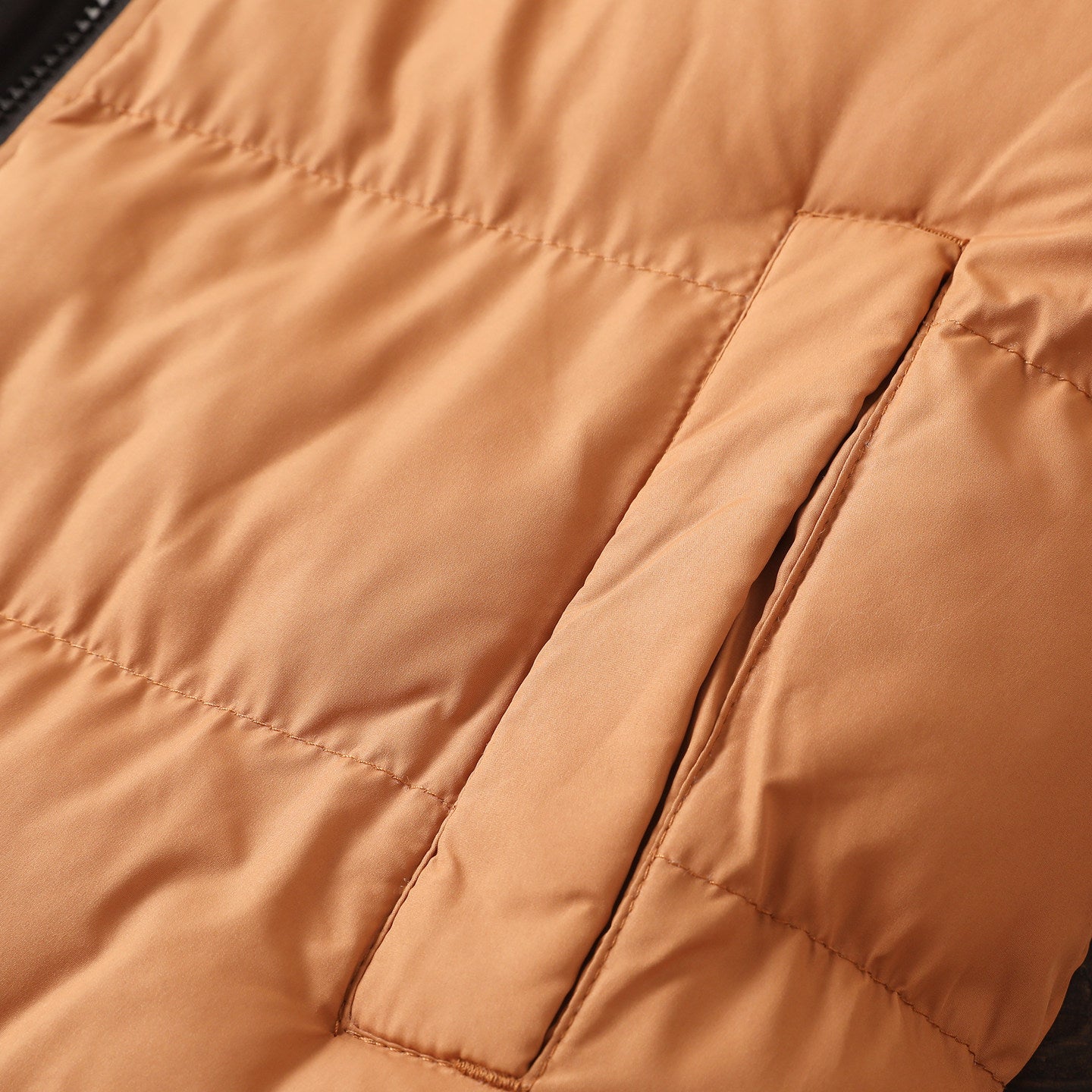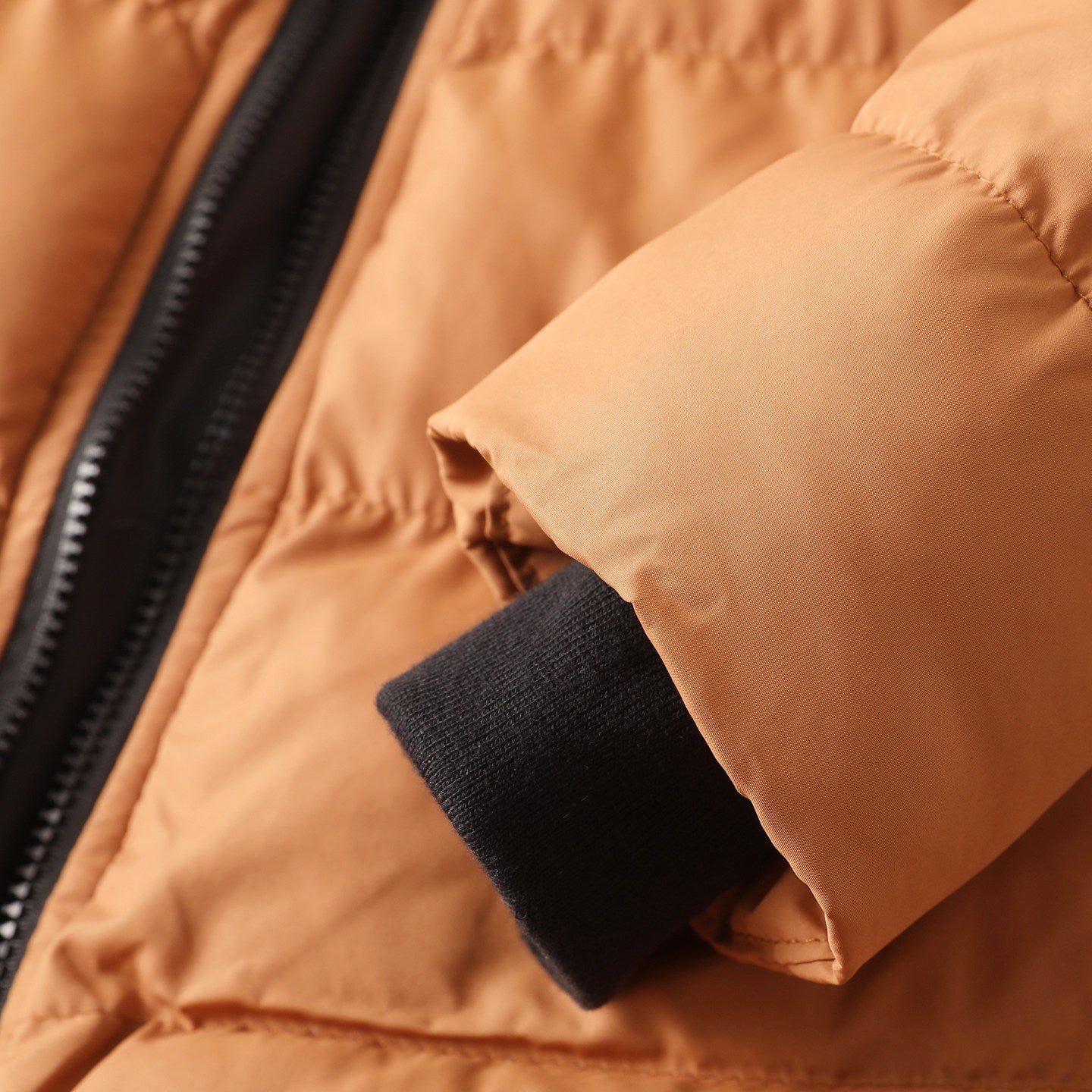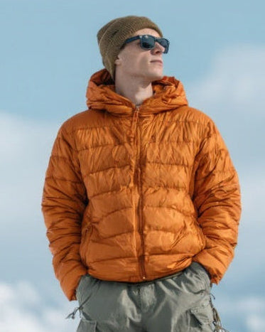 Ashore men's down coat in a warm, tan-brown color. It has a quilted design with horizontal sections that give it a puffy appearance. The jacket features a full zipper down the front and a hood with a dark, black lining. The coat also has two side pockets and black cuffs at the end of the sleeves. The overall style is practical and cozy, likely designed for cold weather. The minimalist design without logos or other markings gives it a sleek and clean look.