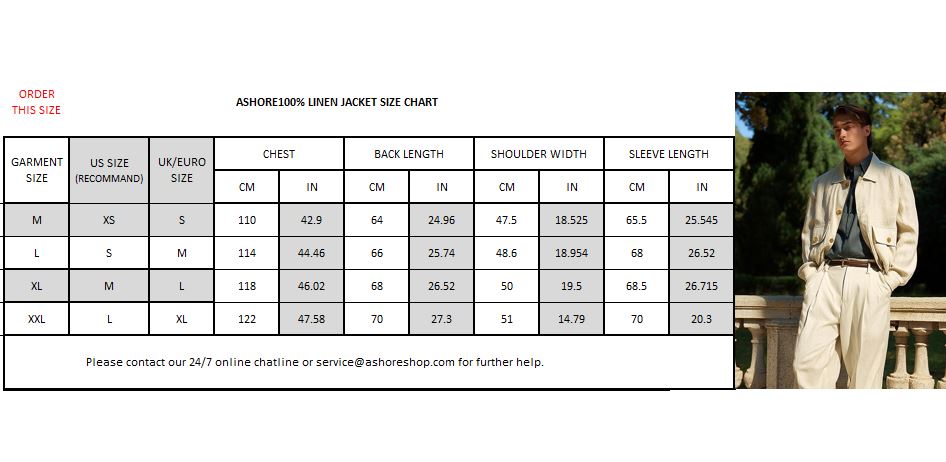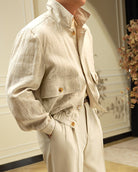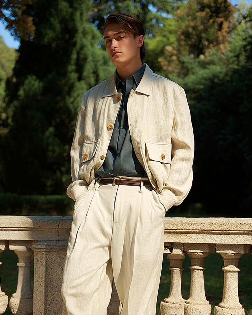 Ashore Shop men’s 100% linen jacket has a refined yet relaxed aesthetic, perfectly suited for warm-weather style. The jacket is crafted from lightweight, breathable linen in a soft cream or off-white tone, giving it an elegant, natural texture with a slightly crinkled finish typical of high-quality linen. It features a structured high collar that adds a modern edge, along with large flap pockets on the chest secured by distinctive gold-tone buttons, which subtly elevate the overall look. The cut is slightly cropped with roomy sleeves and a relaxed fit, creating a balance between sophistication and casual comfort. Paired with matching light trousers and a simple shirt, the jacket conveys a minimal, contemporary, and effortlessly stylish vibe, ideal for spring or summer outings where both comfort and polished style are desired