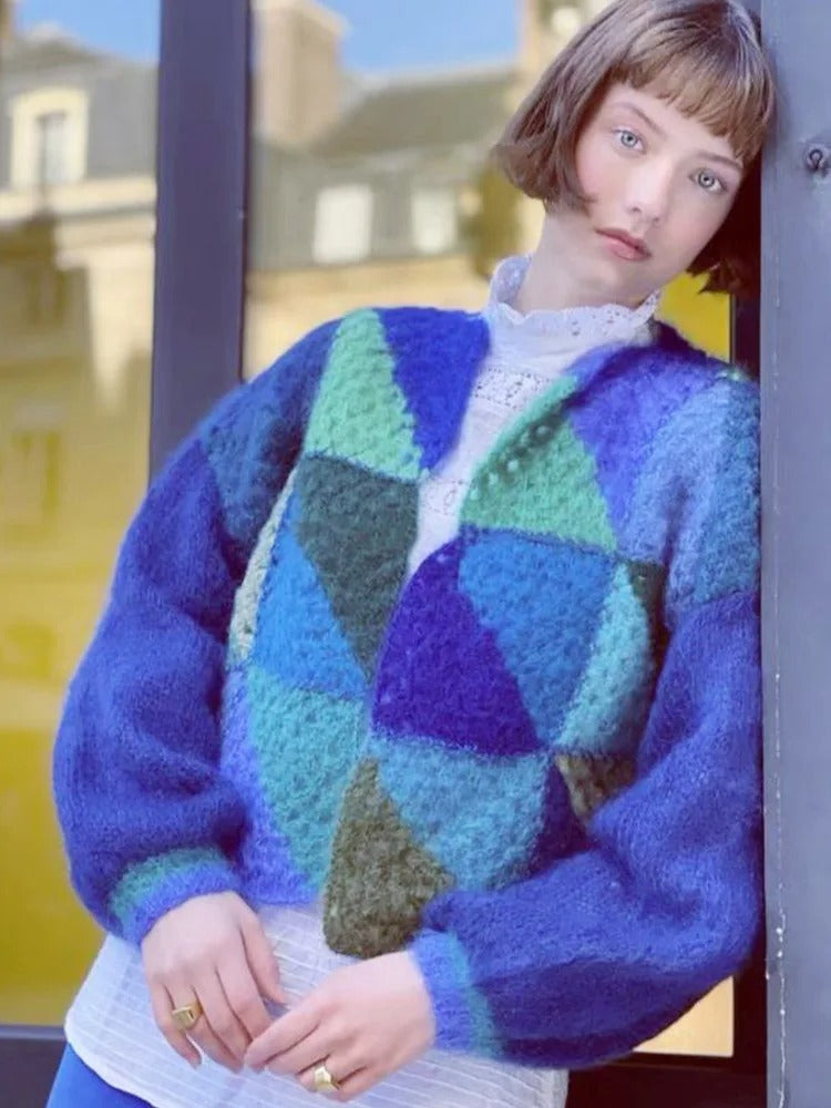 Ashore Shop Mohair Sweaters Geometry Spliced Knitted Cardigans Sweaters Lantern Sleeve Crochet O-neck Loose Knitwear Autumn Women Fashion