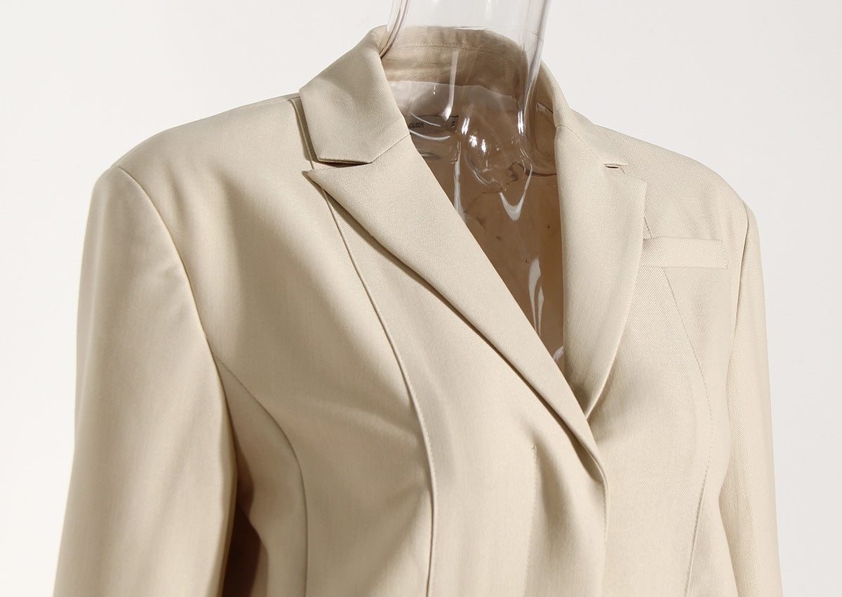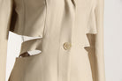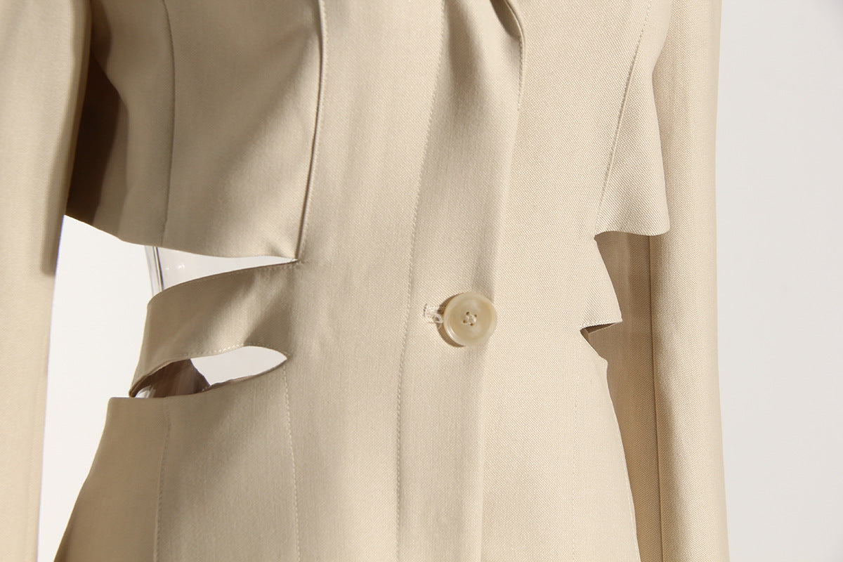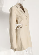 Ashore Shop summer cut-out suit dress is a contemporary, fashion-forward piece that blends the structure of a tailored blazer with the breezy elegance of a mini dress. Crafted in a light beige fabric, the dress features: