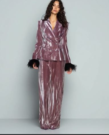 Ashore Shop Women velvet pantsuit is a rich mauve tone with a luminous, crushed texture that catches the light and creates vertical highlights across the fabric. The tailored blazer features a sharp, structured silhouette with strong shoulders, a deep notched lapel, and a double-breasted front accented by subtle metallic buttons, balancing power and elegance. The sleeves end with dramatic black feather cuffs that add movement and a touch of glamour against the sleek velvet. The matching trousers are high-waisted and cut with a long, fluid line, falling straight through the leg with a soft drape that elongates the figure and pools slightly at the hem. Overall, the suit blends classic tailoring with sensual texture and editorial flair, giving it a confident, luxurious, fashion-forward presence.
