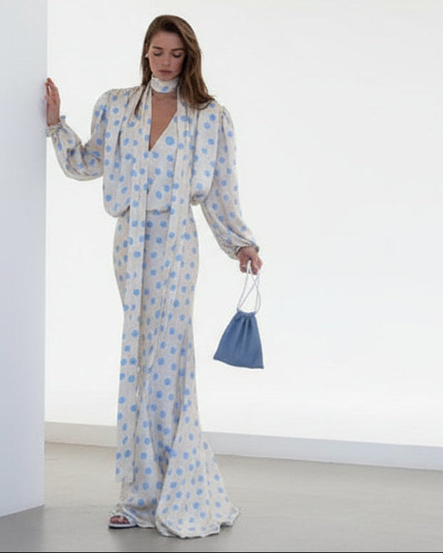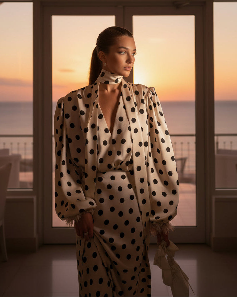 Classic dress is an elegant, vintage-inspired piece with a soft, flowing silhouette. It’s made from a silky, lightweight fabric in an ivory or cream base, covered in evenly spaced black polka dots.