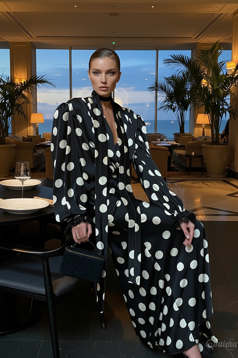 Overall, it combines classic polka-dot charm with sophisticated, modern tailoring—very chic and timeless.