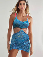 Ashore Mermaid Knit sweater mini dress is a striking and stylish beach  bikini cover-up crafted from soft, melange yarn. It features a halter neckline and a figure-hugging silhouette with a dramatic cut-out design at the midriff, connected by a small metal ring at the center front. The open-knit construction of the fabric lends a see though, breathable quality that makes it perfect for layering over swimwear, offering just the right mix of coverage and allure. The variegated tones of the melange yarn—rich in blues with hints of purples and pinks—add depth and texture to the look, while the mini length and snug fit , sun-ready vibe. This piece blends bohemian charm with modern edge, making it an ideal choice for beach days, poolside lounging, or summer festivals.