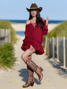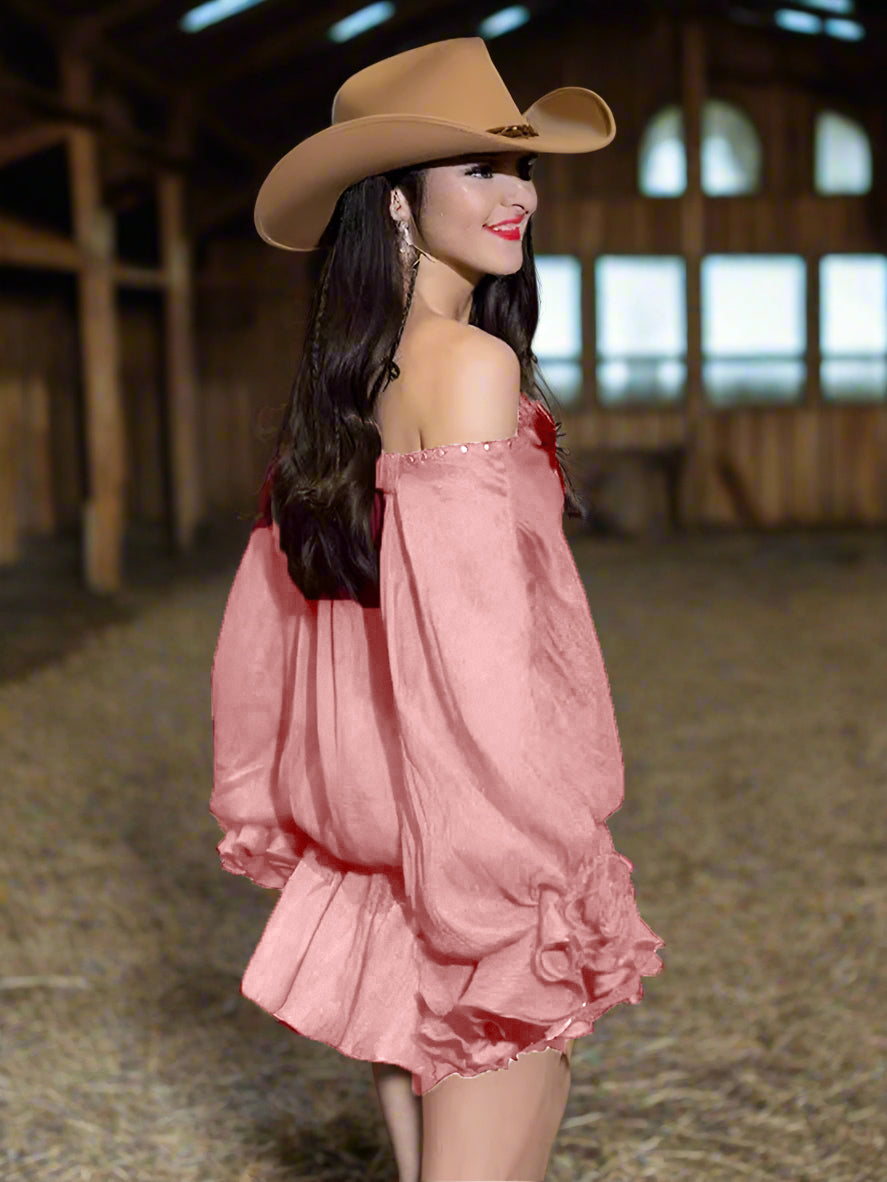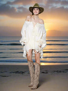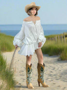 ASHORE charming white long-sleeve shirt dress that blends romantic and bohemian elements. The dress features an off-the-shoulder neckline adorned with a crisscross lace-up detail along the front, adding a soft, feminine touch. The voluminous, billowy sleeves are gathered at the wrists and decorated with oversized fabric flower appliqués, enhancing the dreamy aesthetic. The bodice and skirt have a cinched, elasticated waistline that creates a flattering silhouette, while the hem flares into a gentle ruffle, giving the dress movement and lightness. It's a perfect blend of beachy elegance and western flair, especially paired with the embroidered cowboy boots and straw hat.