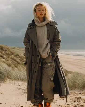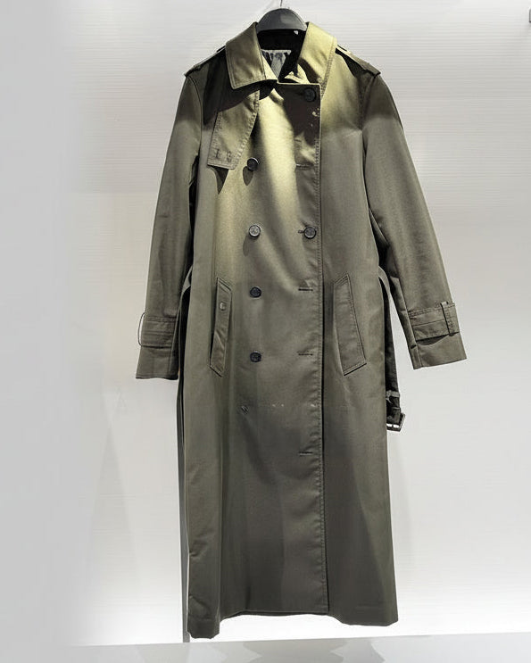 ASHORE Spring women’s long windbreaker trench coat features a timeless, tailored silhouette with a clean, elegant finish. Crafted in a classic beige and dark green tone, it showcases a double-breasted front with dark contrasting buttons, a structured pointed collar, and a matching waist belt that cinches for a flattering shape. The coat is designed with traditional trench details, including shoulder epaulettes, adjustable cuff straps, and discreet side pockets for practicality. Falling below the knee, its long length offers both sophistication and protection from wind and light rain, making it a versatile outerwear piece suitable for both casual and polished looks.