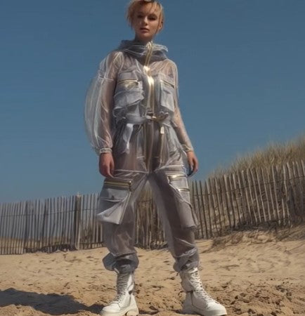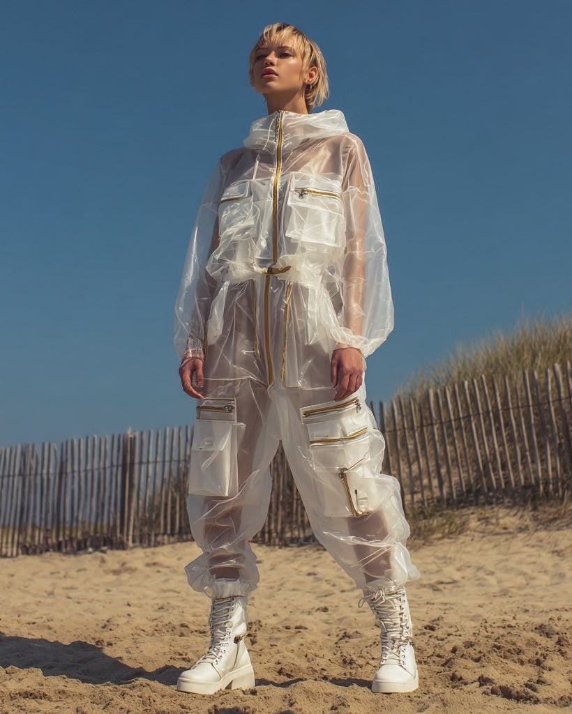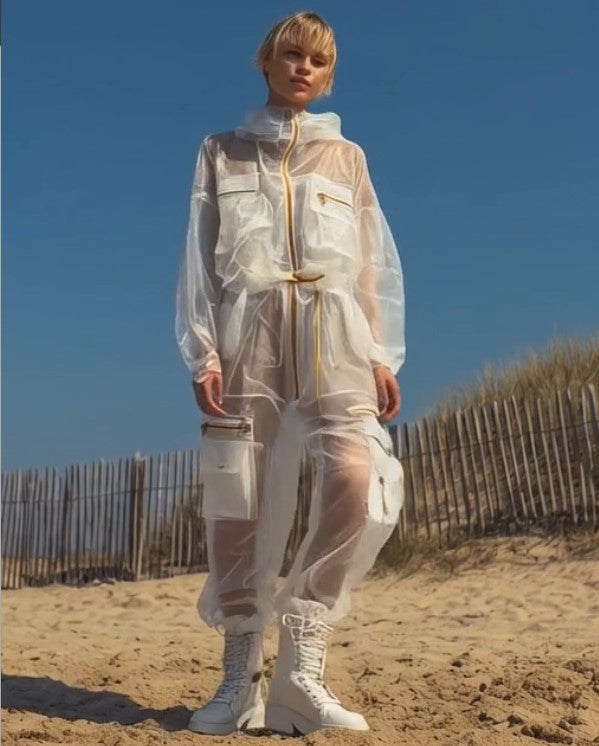 Ashore women’s Silk See Though Organza Beach Anti-UV blends utilitarian edge with luxe polish, featuring a soft, lightweight fabric that catches the light with a subtle sheen while offering anti-UV protection for outdoor wear. The crisp semi-transparent silhouette is elevated by striking gold zippers and trims, adding a refined contrast and a touch of glamour to the functional design. Multiple zippered pockets, a cinched waist, and a front zip closure create a flattering, structured fit that’s both practical beach swimsuit cover up and fashion-forward. Finished with tapered legs and a relaxed yet confident vibe, this jumpsuit feels equally at home styled for coastal adventures or elevated streetwear moments.
