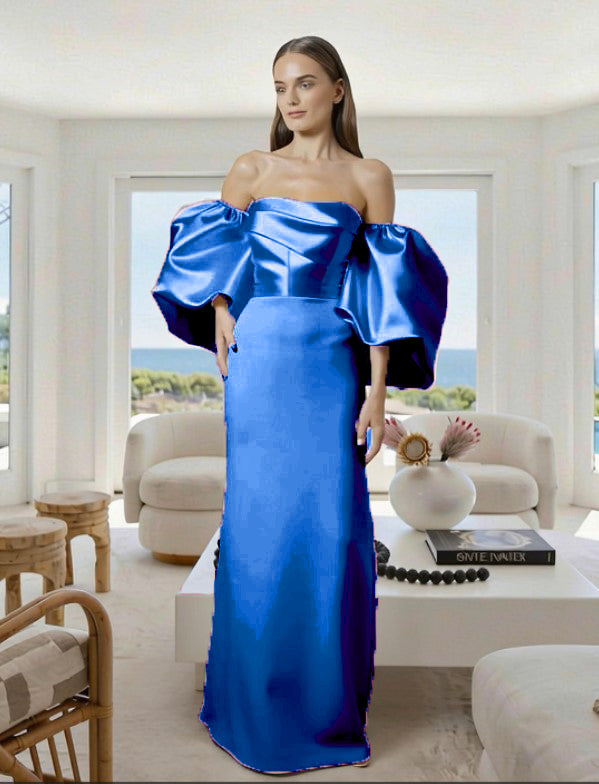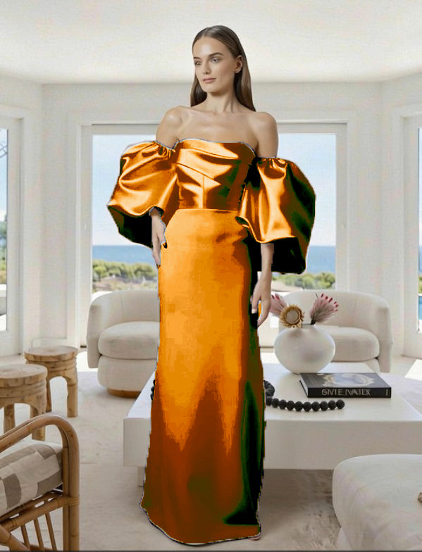 Overall, this gown combines minimalist elegance with dramatic, statement-making details, making it ideal for a red carpet event, gala, or upscale formal occasion.