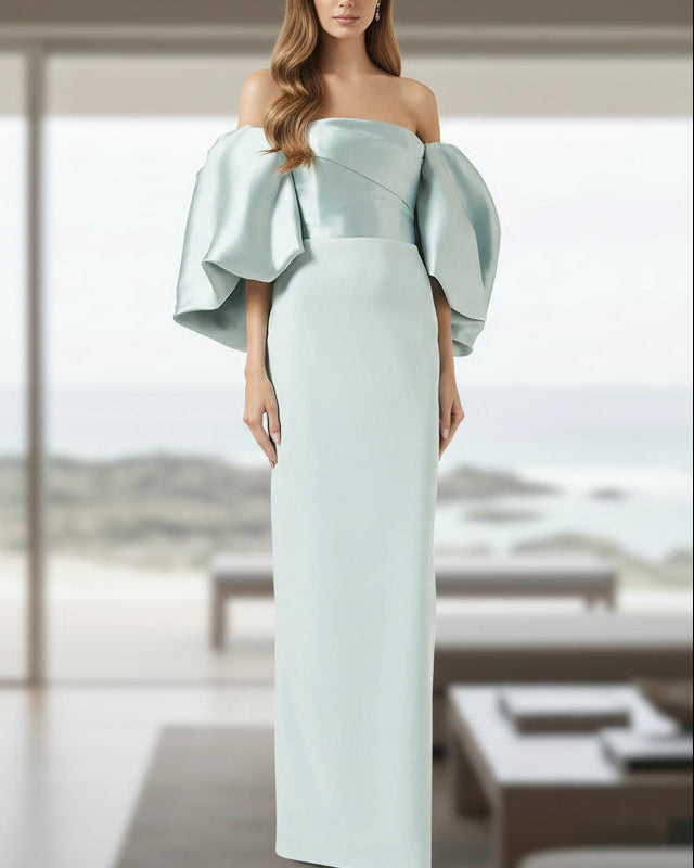 • Silhouette & Fit: The dress features a straight, floor-length silhouette that gently skims the body, creating an elegant, elongated look. It is form-fitting through the torso and hips, then falls straight to the hem.