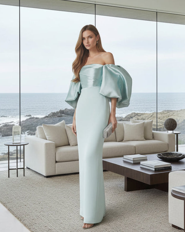 • Neckline & Shoulders: The gown has an off-the-shoulder neckline, emphasizing the collarbones and shoulders for a sophisticated, feminine touch.