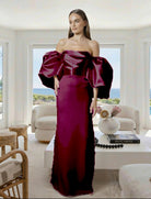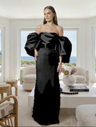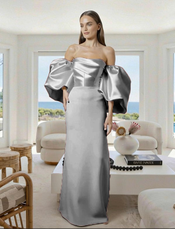 • Sleeves: The standout feature is the dramatic, oversized puff sleeves, which are sculptural and voluminous. They create a bold, avant-garde effect and add architectural interest to the otherwise sleek dress.