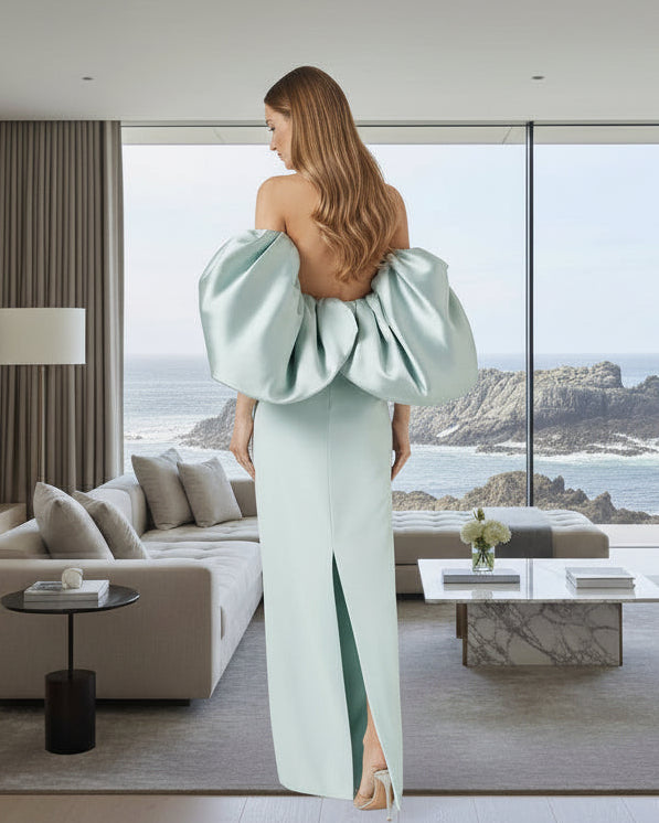 • Back Design: The back is low and open, adding a subtle sensual element and balancing the volume of the sleeves.