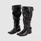 Women tall, tan suede cowboy boots standing upright against a plain white background. The boots have a soft, velvety texture typical of suede material and feature a slightly pointed toe design. They have a medium-high black block heel with a smooth texture, providing a subtle yet sturdy elevation. The upper part of the boots is adorned with two decorative silver studs on each side, adding a touch of elegance. A wide, adjustable brown leather strap with silver buckle and small metal eyelets is situated near the top of the boots, allowing for customization of the fit. The boots also have a small, circular silver stud on the outer side near the heel. The overall style is both practical and fashionable, suitable for both casual and Western-inspired outfits.