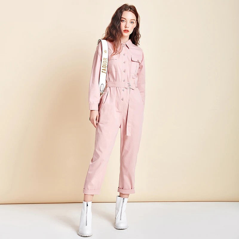 Ashore Shop New Women Jumpsuit 100% Cotton Fashion High Waist Button Jumpsuit with Belt