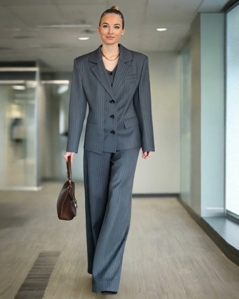 • Pinstripe pattern running vertically, creating an elongated and structured look.