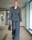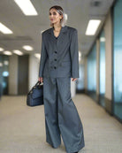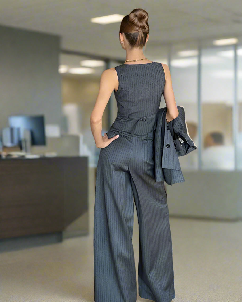 Ashore Shop pinstripe three-piece pant suit set is a classic, sophisticated ensemble that's often associated with power dressing and timeless elegance. Based on the image you've provided, here’s a detailed description of the pinstripe three-piece pant suit set: