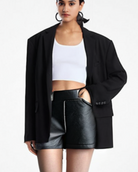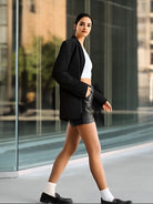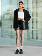 Ashore Shop women's set features a bold, fashion-forward combination of a wide-shoulder loose blazer and PU leather mini shorts. The blazer is designed with an oversized silhouette, structured shoulders, and a relaxed fit, offering a powerful and modern look. Its longer length and minimal detailing make it versatile and effortlessly chic. Paired with sleek, high-waisted PU leather mini shorts, the outfit creates a striking contrast in texture—tailored yet edgy. Perfect for making a confident statement, this set blends masculine tailoring with feminine allure, ideal for street style, nights out, or elevated casual wear.