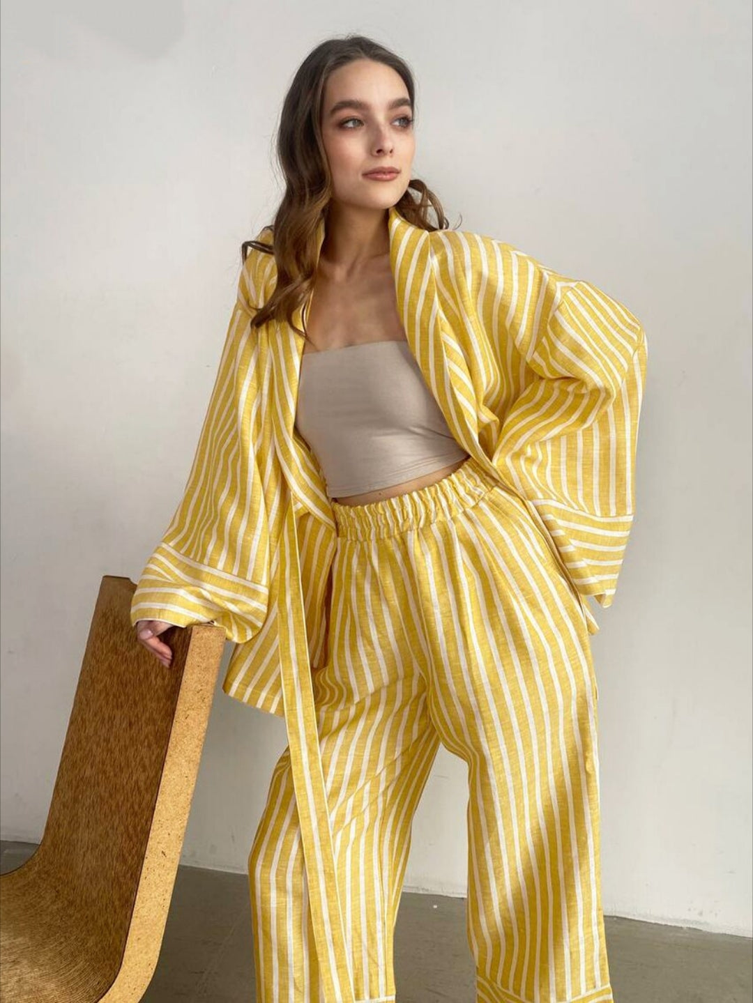 Ashore Shop Casual Yellow Stripe Home Suits Elegant High Waist Wide Pants Set Fashion Long Sleeve Shirts Two Piece Set Women Outfit
