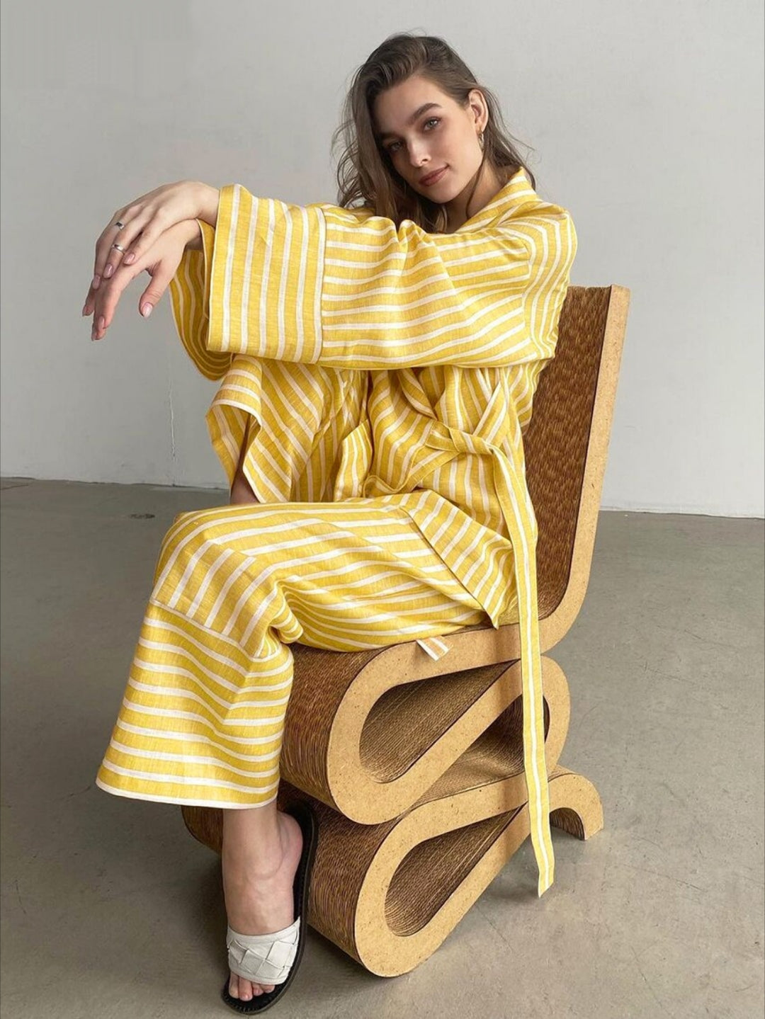 Casual Yellow Stripe Home Suits Elegant High Waist Wide Pants Set Fashion Long Sleeve Shirts Two Piece Set Women Outfit