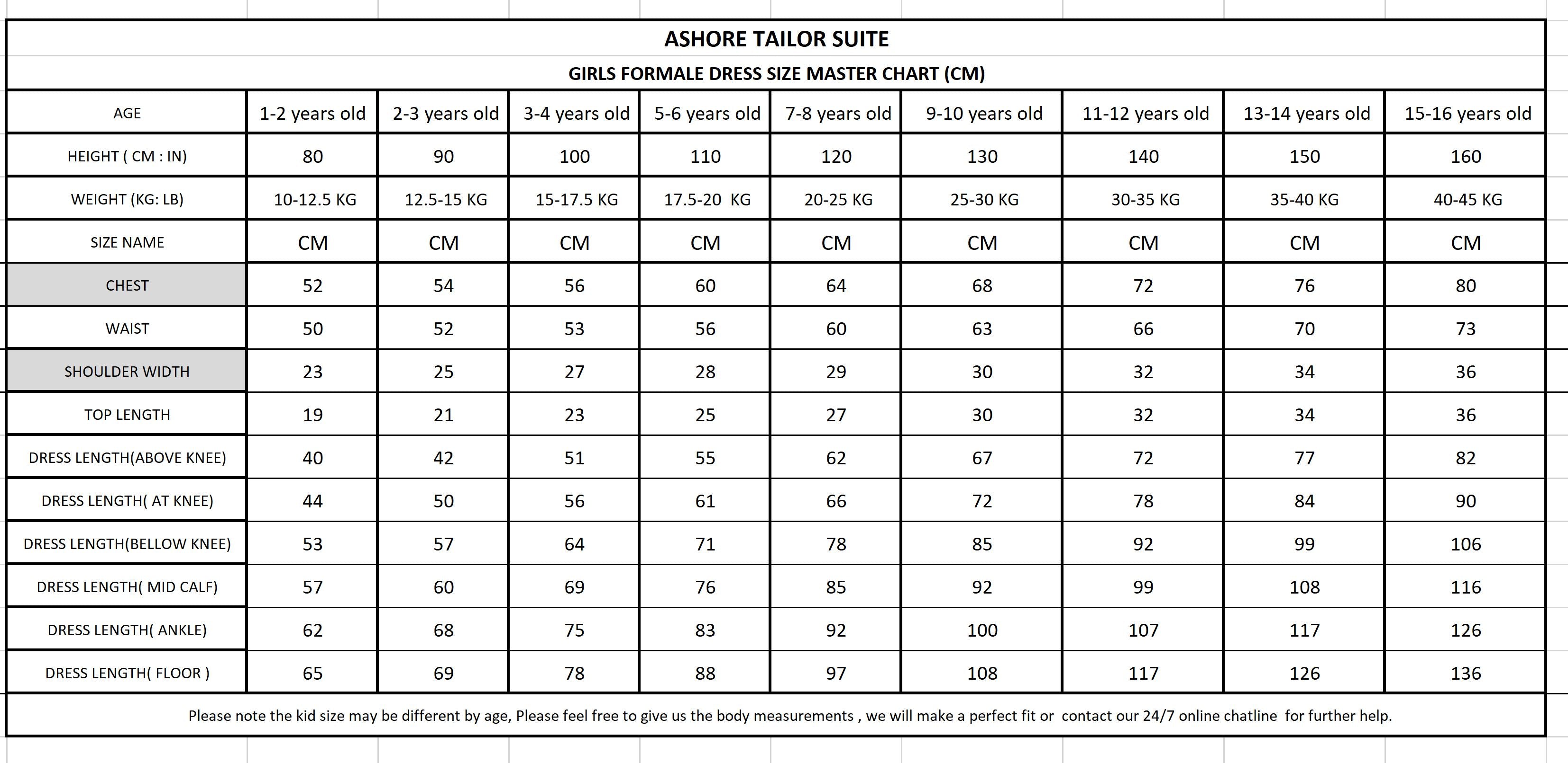 Ashore Shop TAILOR SUITE Master Size Chart of Girls Formal Dresses