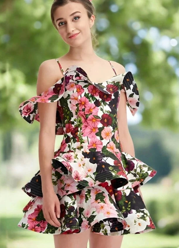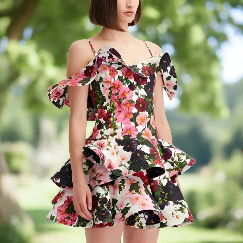 Desinger Ruffles Dress For Women Square Collar Sleeveless High Waist Hit Color Floral Print Slim Dresses Female