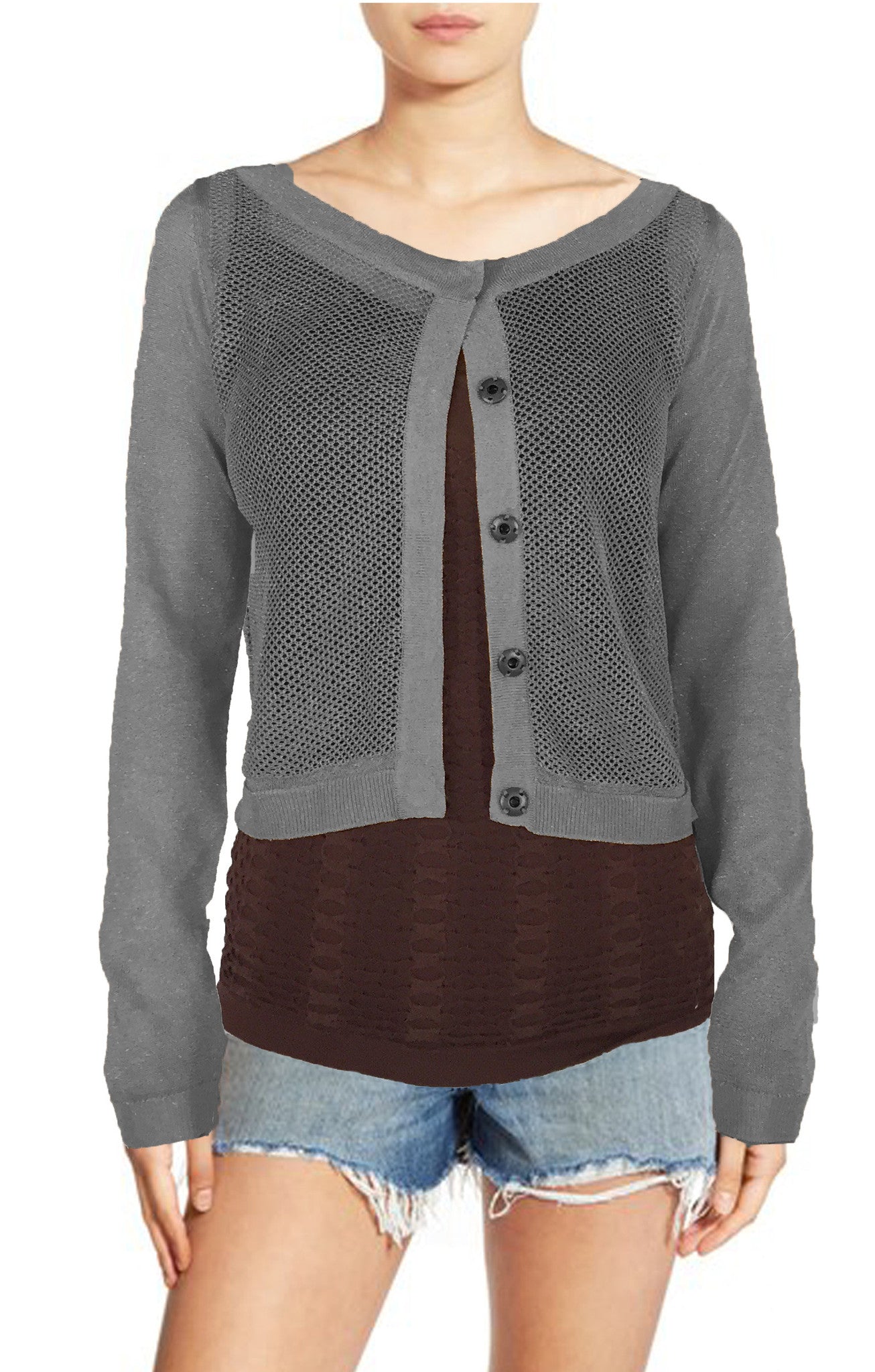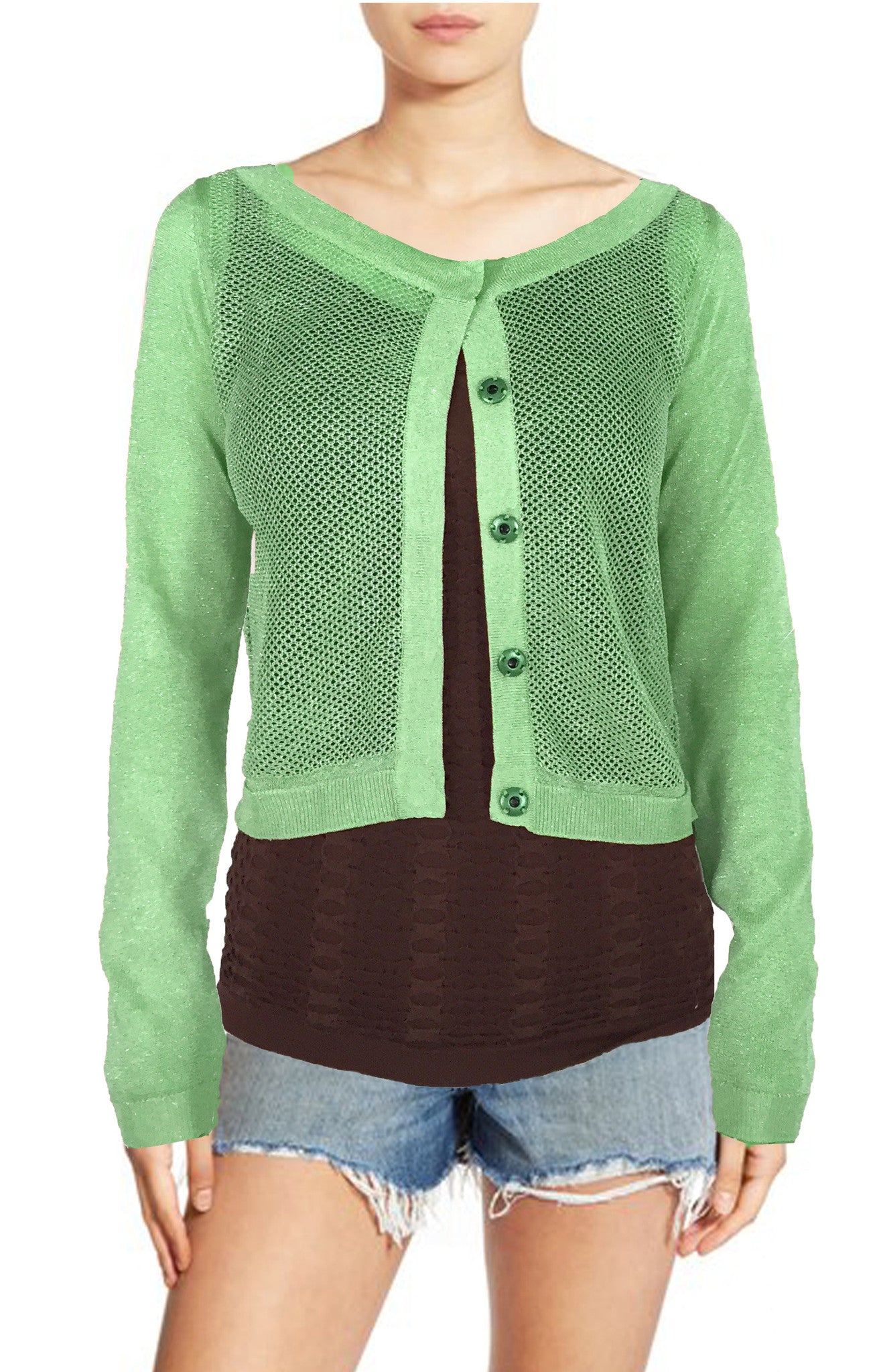 Delicate net weave cardigan in a waist-skimming shape with long sleeves. The lusciously Lurex knit is accented with hidden snap front placket.