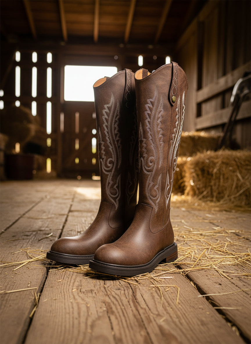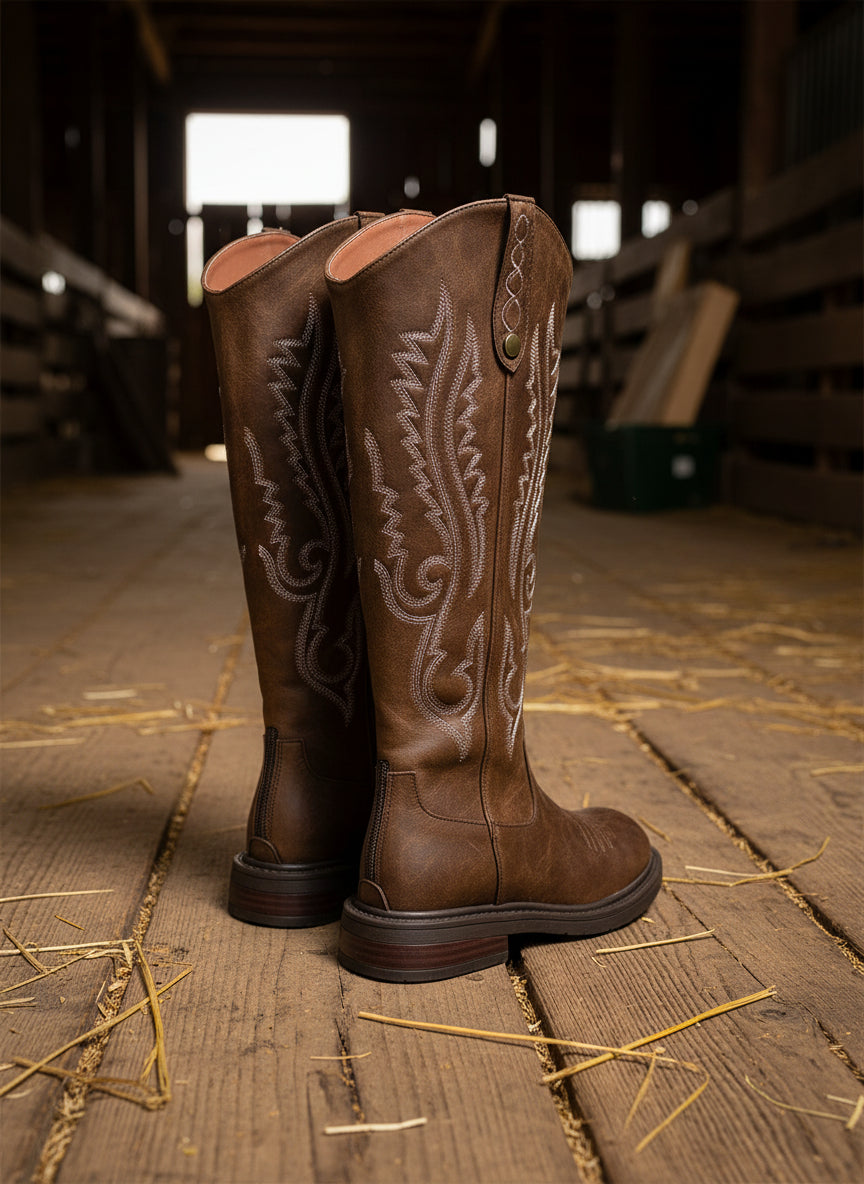 Western Embroidery Cowgirl Boots Low Heel Slip On Flat Boots