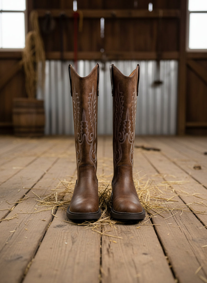 women’s slip-on western cowgirl boots feature a classic silhouette crafted from rich brown leather with a softly distressed finish. The mid-calf shaft is accented with bold turquoise-toned embroidery in a traditional flame-inspired western pattern, adding visual contrast and a handcrafted feel. Designed for easy wear, the boots have pull tabs at the top and a smooth slip-on construction. A low stacked heel and subtly squared toe provide comfort and stability while maintaining authentic cowboy style. Blending timeless western heritage with everyday practicality, these boots are ideal for casual outfits or modern rustic looks.