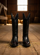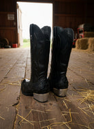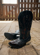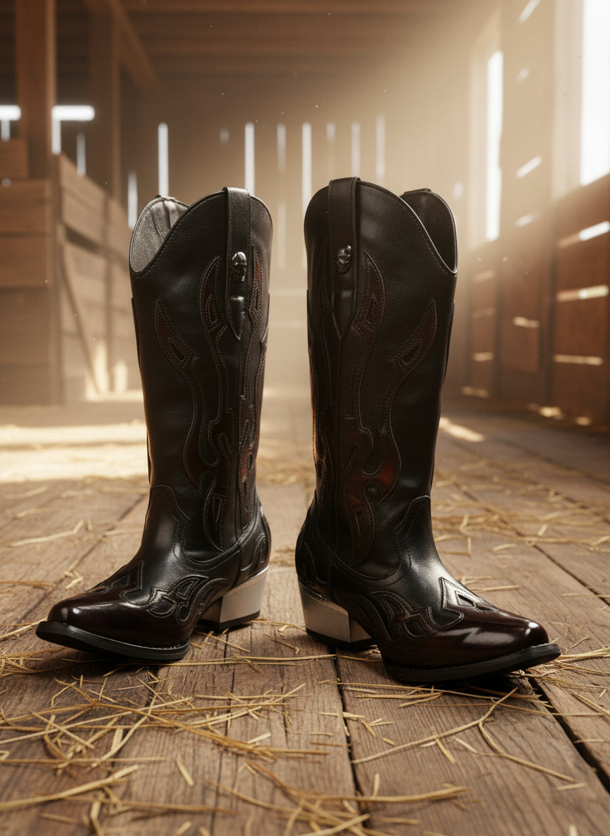 women’s vintage cowgirl boots showcase a bold, timeless western aesthetic crafted from smooth black leather with a subtle sheen. The tall shaft is decorated with tonal and dark brown embroidered flame-style patterns that add depth and classic cowboy character without overwhelming the design. Featuring a traditional pointed toe and a contrasting low angled heel, the boots balance elegance with practicality. A slip-on construction with discreet side pull tabs ensures easy wear, while the sturdy sole and heel provide reliable comfort. With their striking silhouette and refined vintage detailing, these boots are perfect for making a confident western-inspired statement in everyday or styled looks.