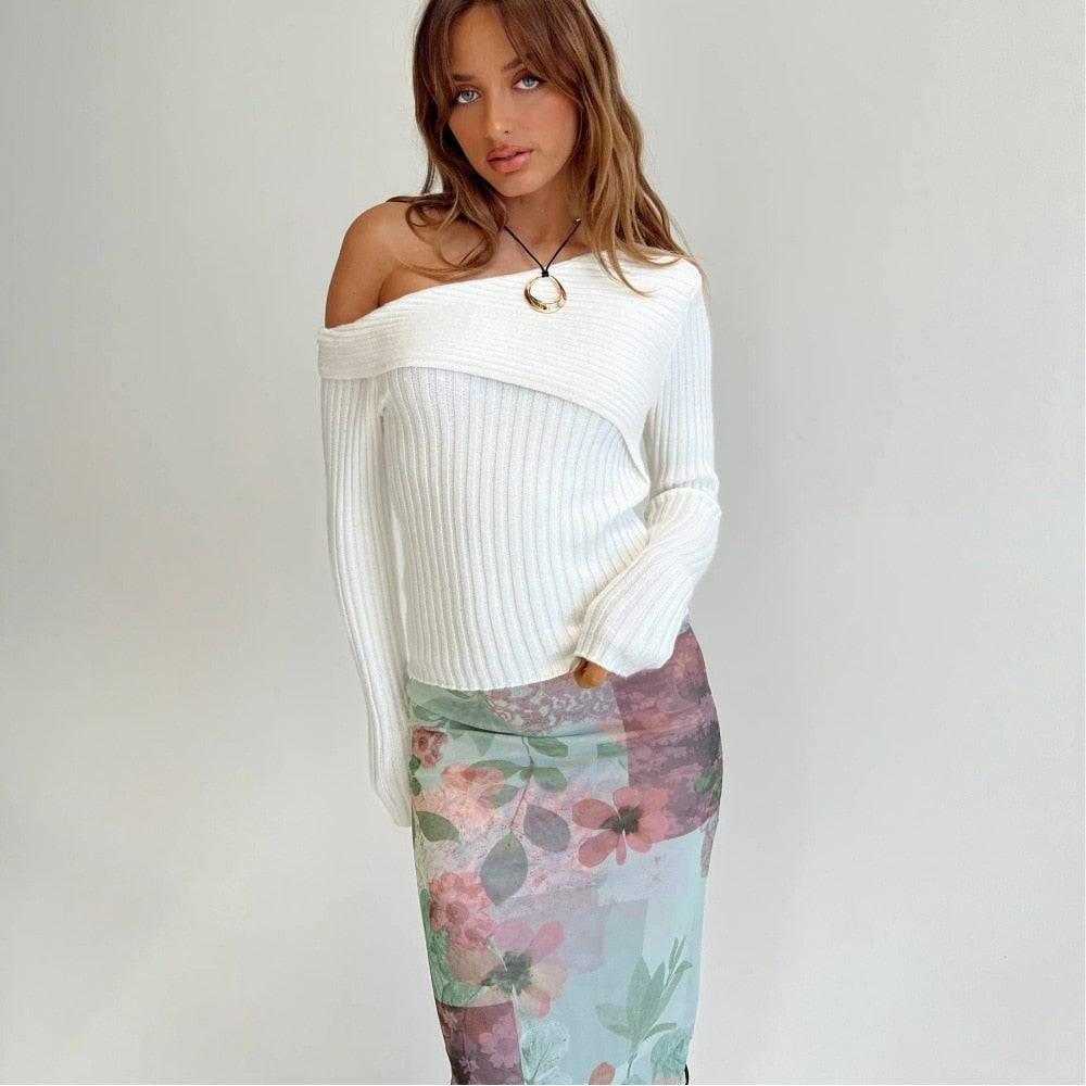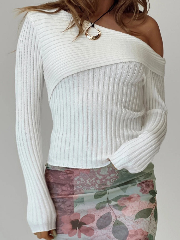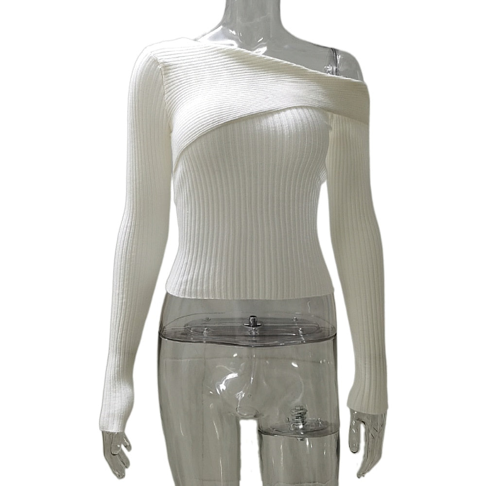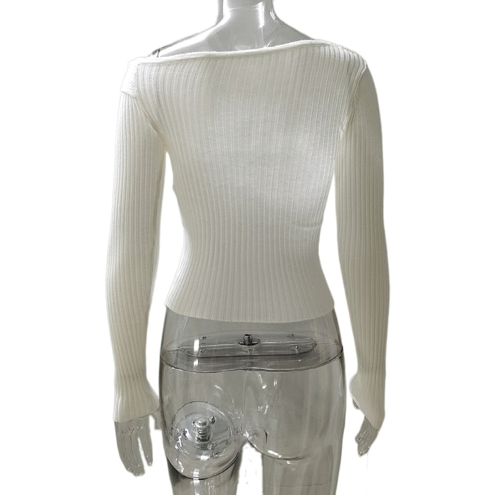 Fall Winter Irregular Neck White Tops for Women Ribbed Knit Long Sleeve Sexy Slim Top
