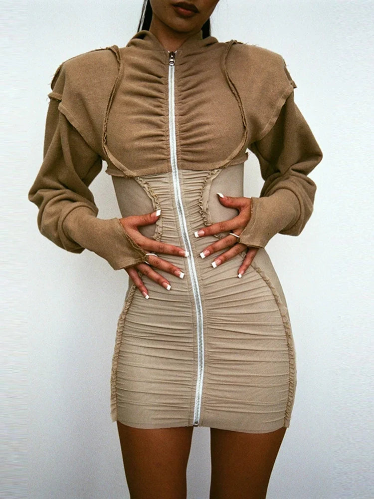 Bulk Orders Fall Women Rucked Casual Dress Hooded Long Sleeve Patchwork Mini Ladies Dress Solid Slim Dress
