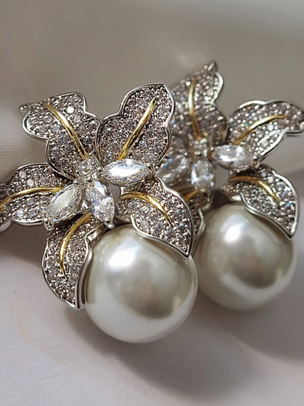 Ashore Shop Beautiful Flower Women's Pearl Imitation Earrings Inlaid Sparkling Stone