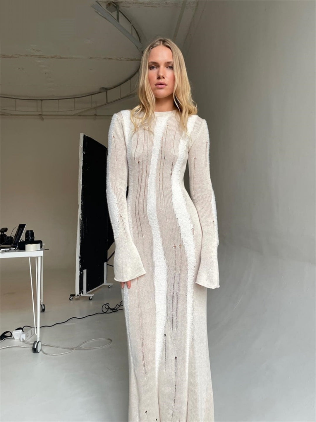 Knitted O Neck Long Sleeve Sweater Dress Beach Cover Ups Women
