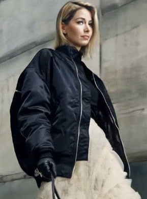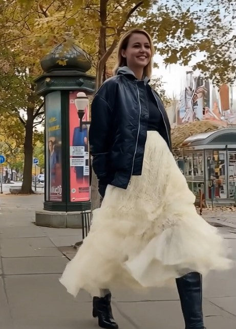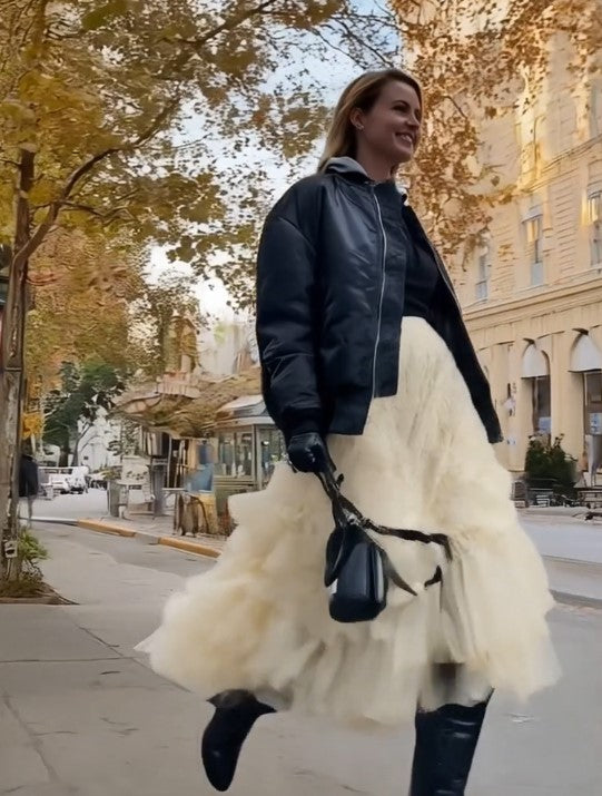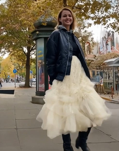 Ashore outfit features a striking contrast between structure and softness, built from two standout pieces. The oversized black jacket has a bold, voluminous silhouette with padded aviator-style construction, giving it a strong, utilitarian edge. Its slightly glossy finish, relaxed shoulders, and roomy fit create a powerful upper-half shape. Paired with it, the ivory ruffled skirt brings movement and delicacy—layers of sheer mesh cascade in soft, airy tiers, creating fluid motion with every step. Together, the combination blends urban toughness with romantic elegance, resulting in a visually dynamic and fashion-forward look.