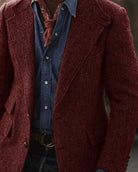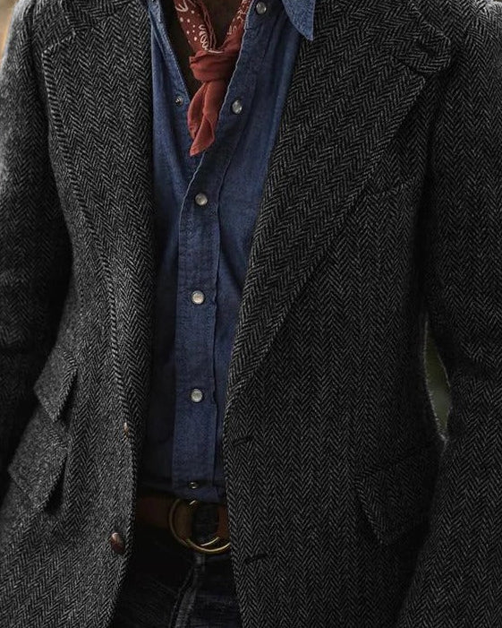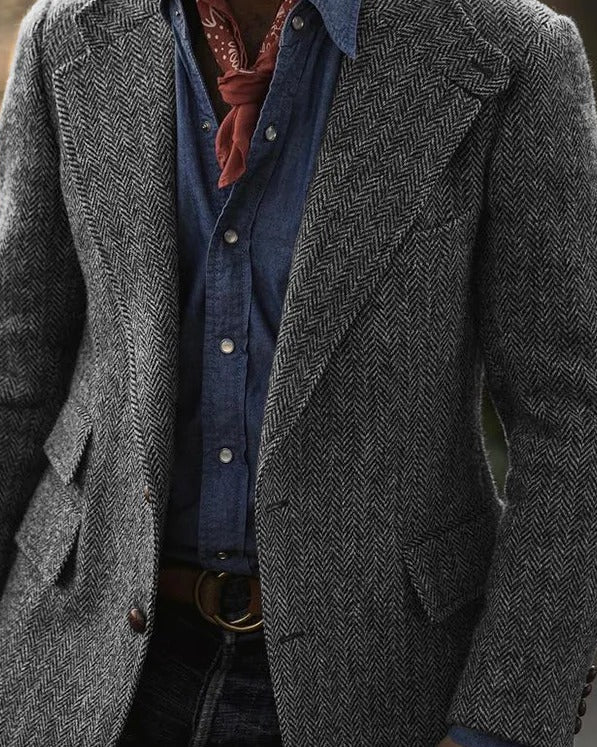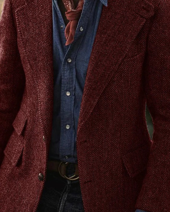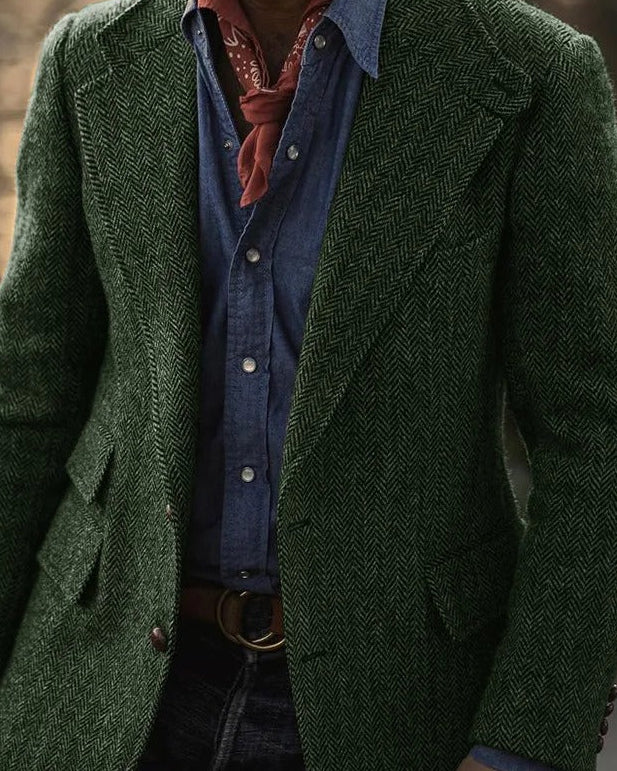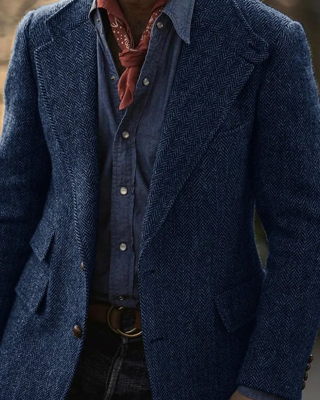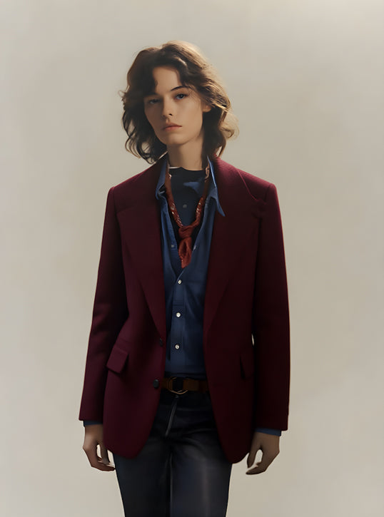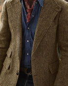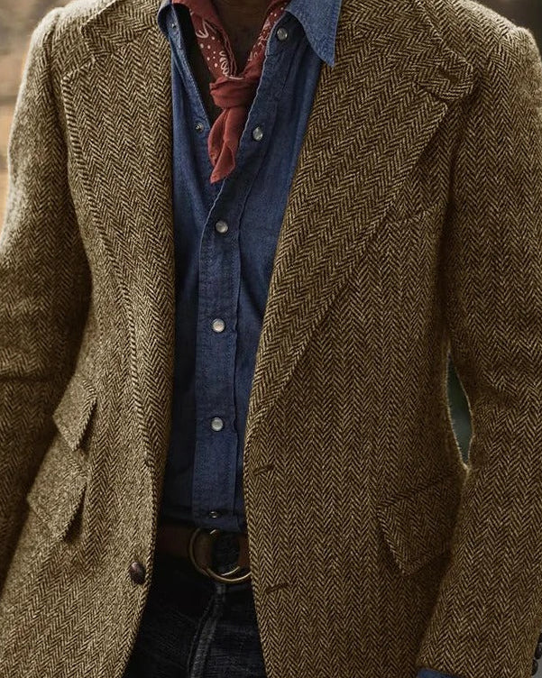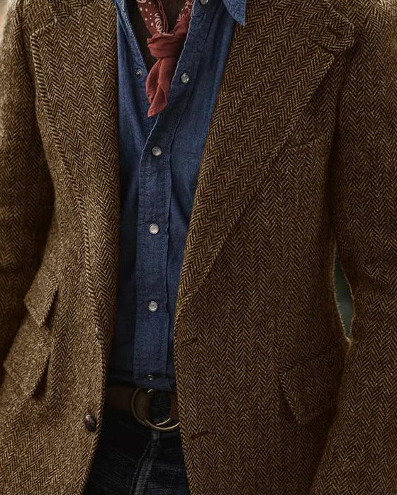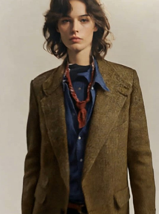 Ashore Shop X TAILOR SUITE classic herringbone blazer, which has a warm, golden-brown color with a distinct, textured zigzag pattern. The blazer has sharp tailoring with a slim fit, featuring a notched collar and flap pockets. Underneath the blazer, she wears a light blue shirt, which contrasts subtly with the warmth of the jacket. Her sleeves are slightly rolled up, revealing the blue cuffs. Her hair is long, wavy, and light blonde, and she accessorizes with dangling earrings. The outfit combines sophistication with a touch of casualness, presenting a polished yet approachable look.