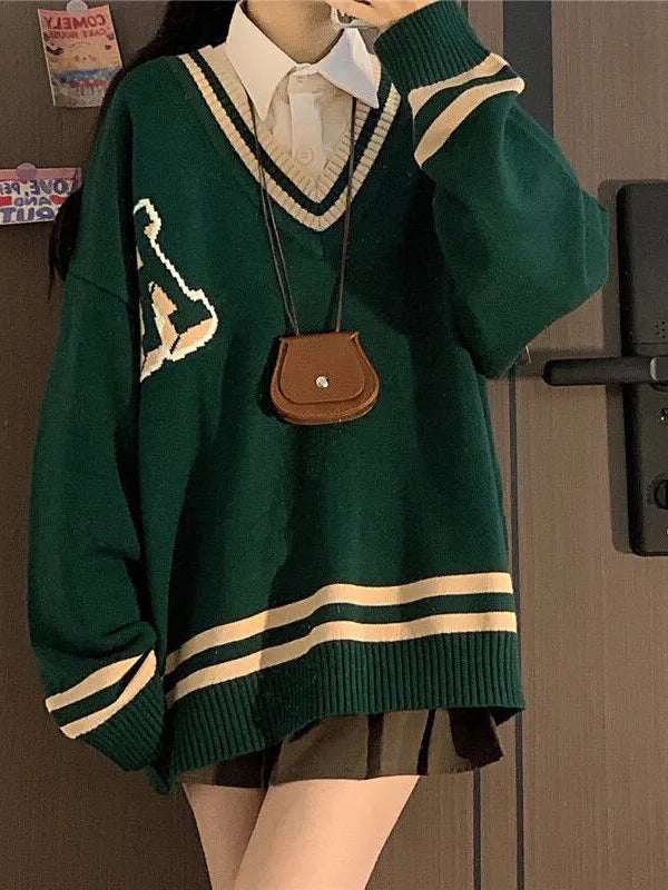 Rugby Striped Green Oversize Sweater Women Harajuku Preppy Fashion Blue V-neck Long Sleeve Jumper Female Tops
