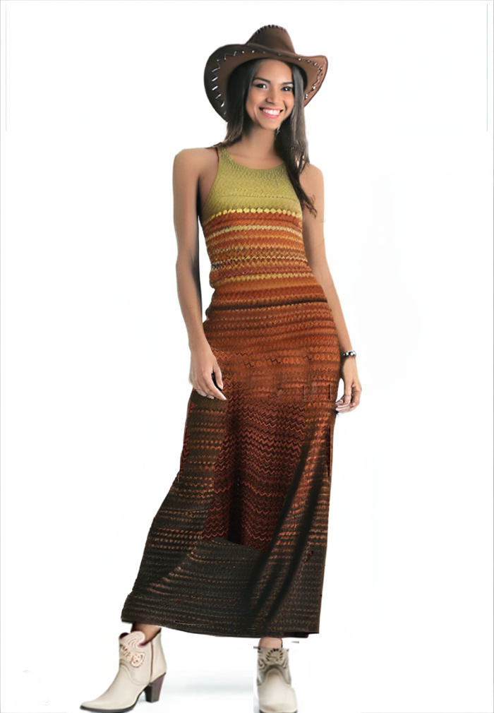 Women's Knitted Gradient Orange Stripe Western Maxi A-Line Dress is a stylish, modern dress designed to offer both comfort and fashion. Here’s a detailed description: