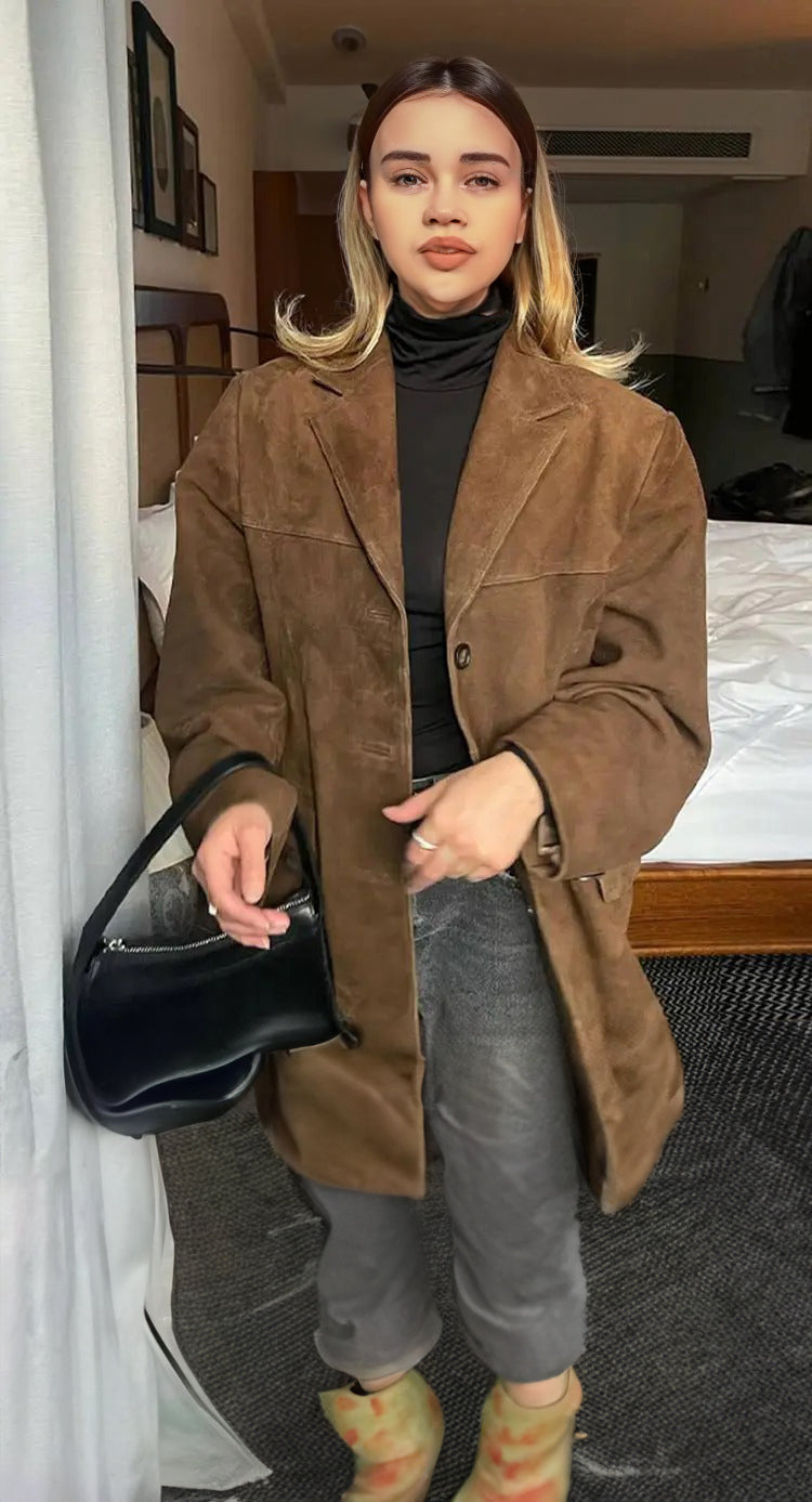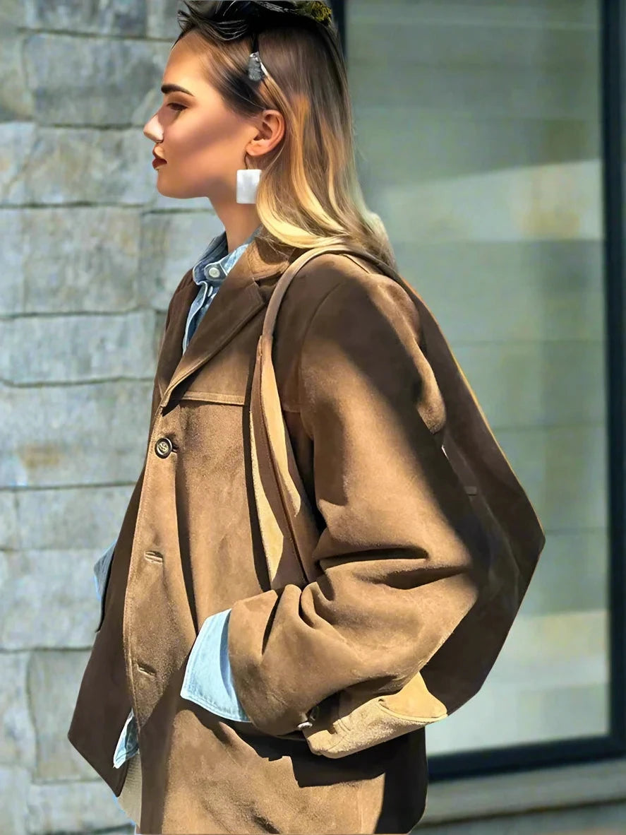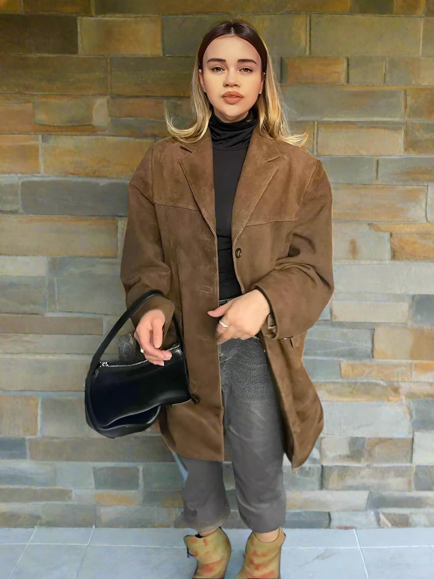 Vintage Appeal: The coat’s classic cut and suede material give it a timeless, vintage feel, making it a standout piece that can be effortlessly styled across seasons.