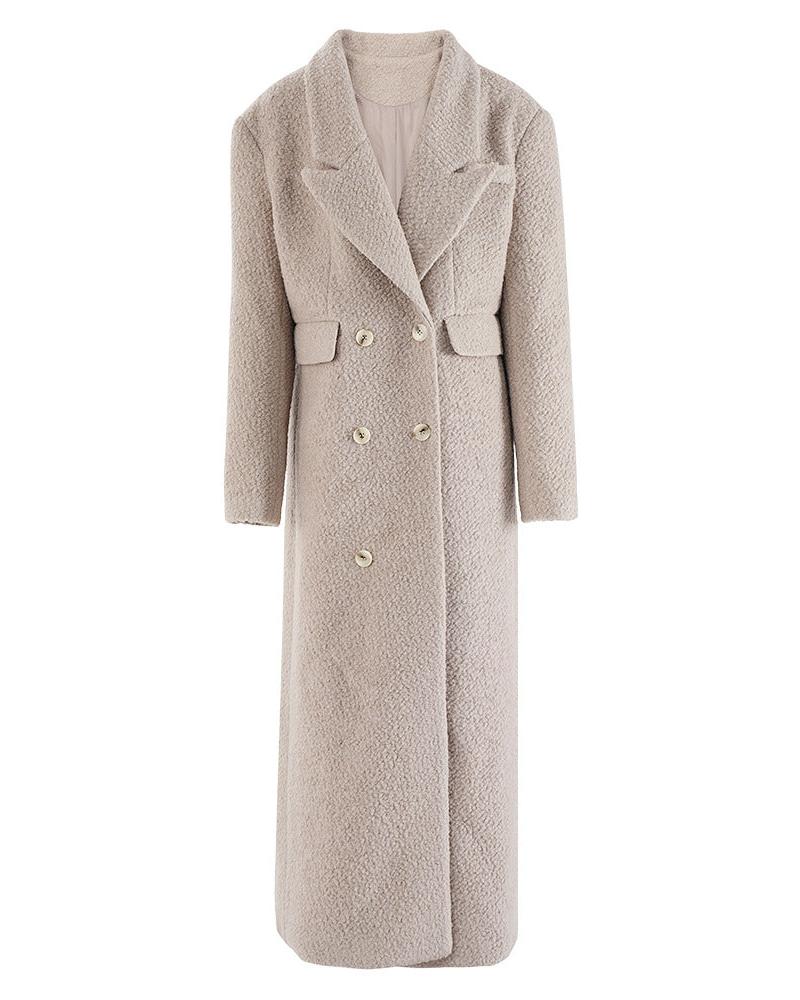- Double-Breasted Front: The coat showcases a classic double-breasted silhouette, giving it a timeless and sophisticated look. The double buttons provide an added layer of style and functionality, while the design helps to cinch in the waist for a flattering fit.