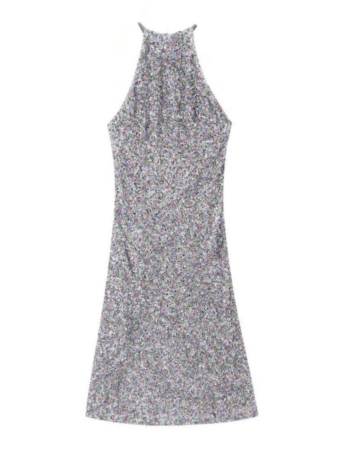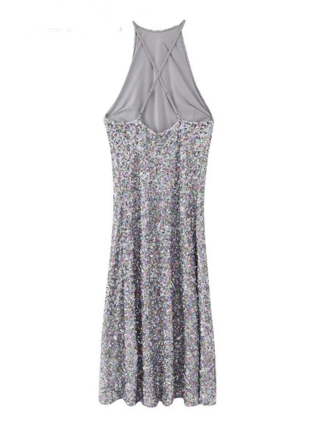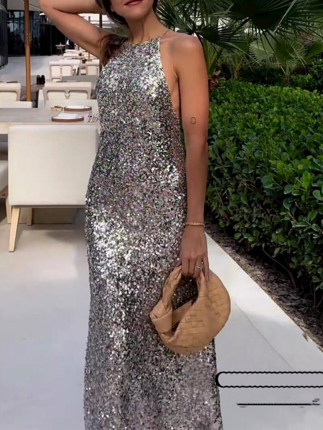 • ASHORE SHOP Summer Sexy Multi Color sequins Dress Women Halter Dress  Sequins Overlay Draped Sleeveless Backless Bodycon Female Midi Long Dresses Club