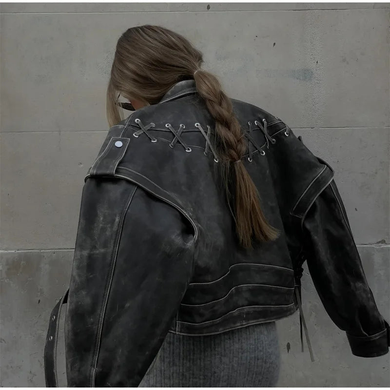 Ashore Punk Biker Shop Vintage Washed Leather Zipper Solid Faux Leather Short Coats Women Chic Long Sleeve Irregular Lapel Coat Elegant Female High Street Outerwear