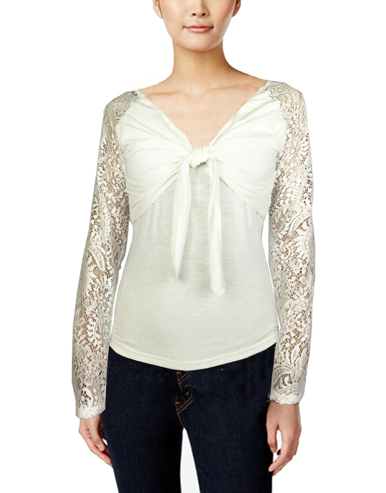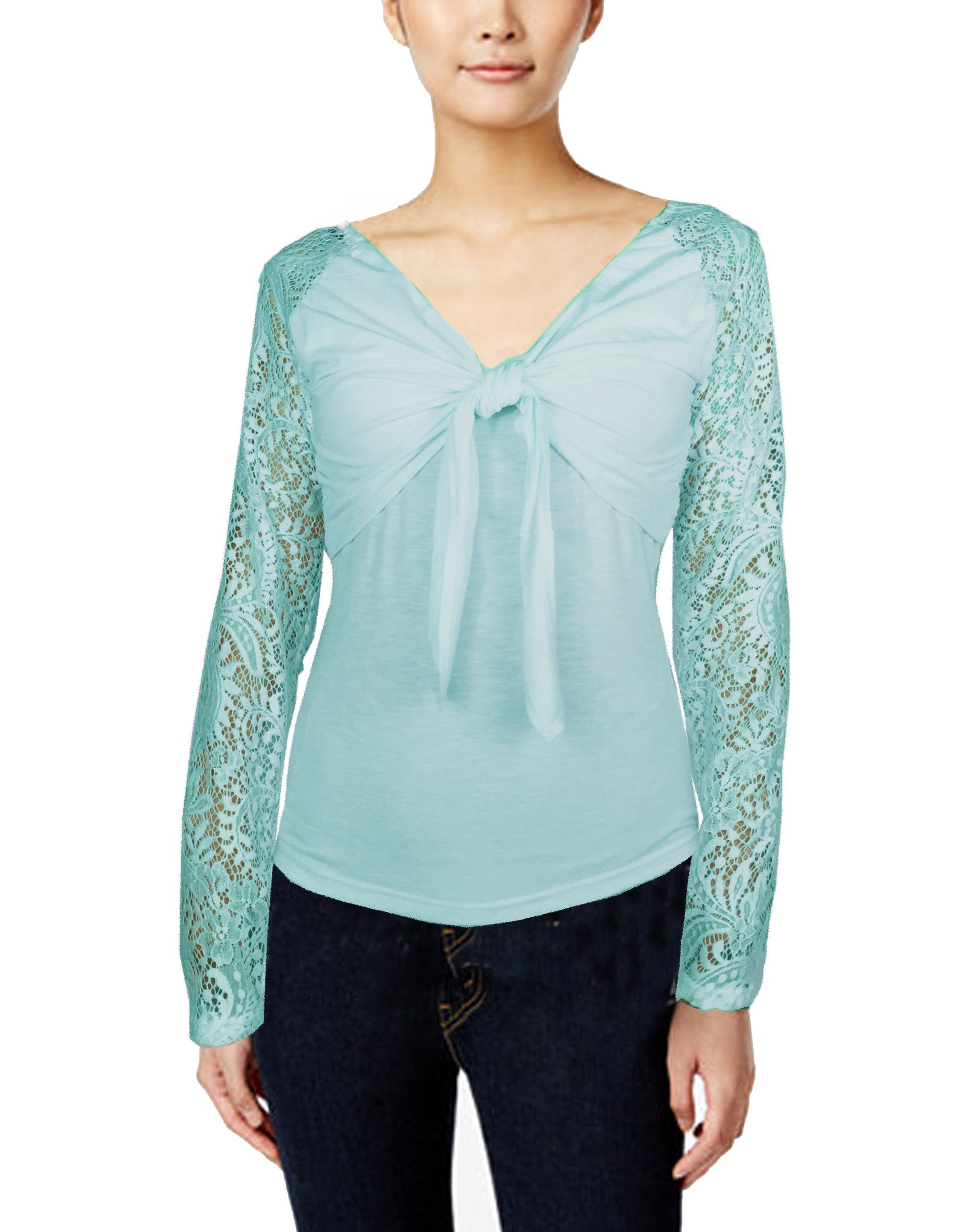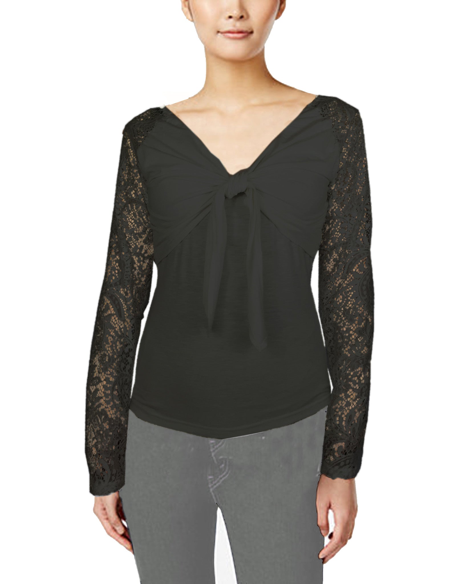Stylish feminine cut blouse with adjustable bow-tie chest. Stretch lace long sleeves and high/low curved hem gracefully fit your frame.