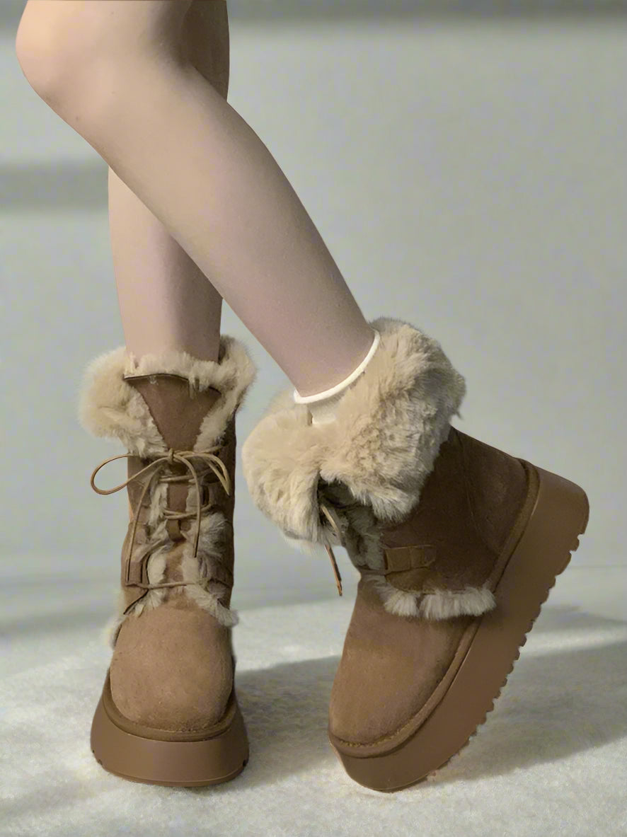 Ashore Winter Shop women’s winter boots are cozy and stylish, designed for warmth and comfort. They feature a soft brown suede exterior with a sturdy, slightly raised rubber sole for durability and traction in cold weather. The standout detail is the plush faux fur lining that folds over the top, creating a fluffy, voluminous cuff in a light beige shade. Decorative laces with fur pom-pom accents add a playful yet chic touch. These boots are ideal for pairing with casual winter outfits, offering both functionality and a fashionable look for chilly days.