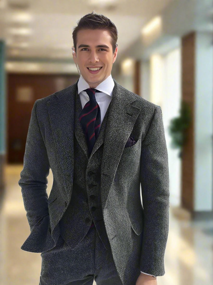 Mens Formal Suit Sets Gray Wool Tweed Winter Men Suit's For Wedding Formal Groom Tuxedo Herringbone Male Fashion 3 Piece (Jacket +Vest +Pants+Tie)