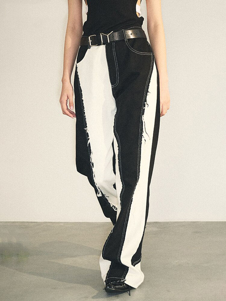 Baggy Pants Women's Jeans Irregular Stitching Contrast Color Rough Edge Straight High Waist Denim Pants Autumn