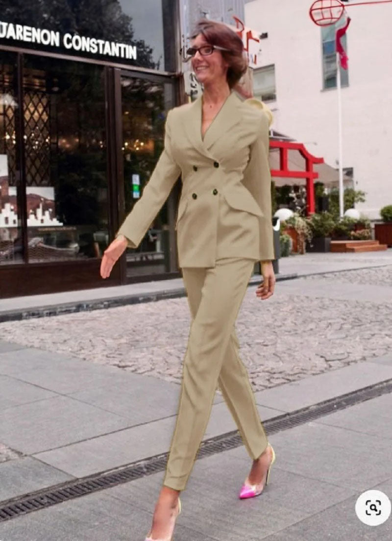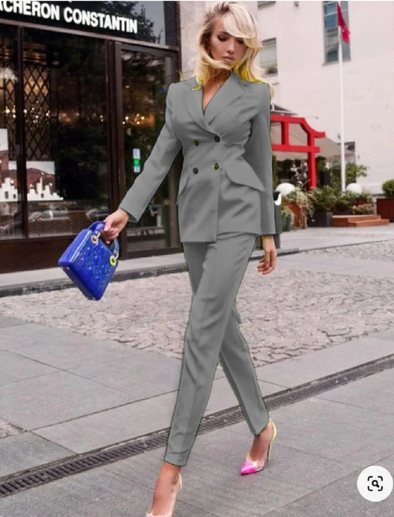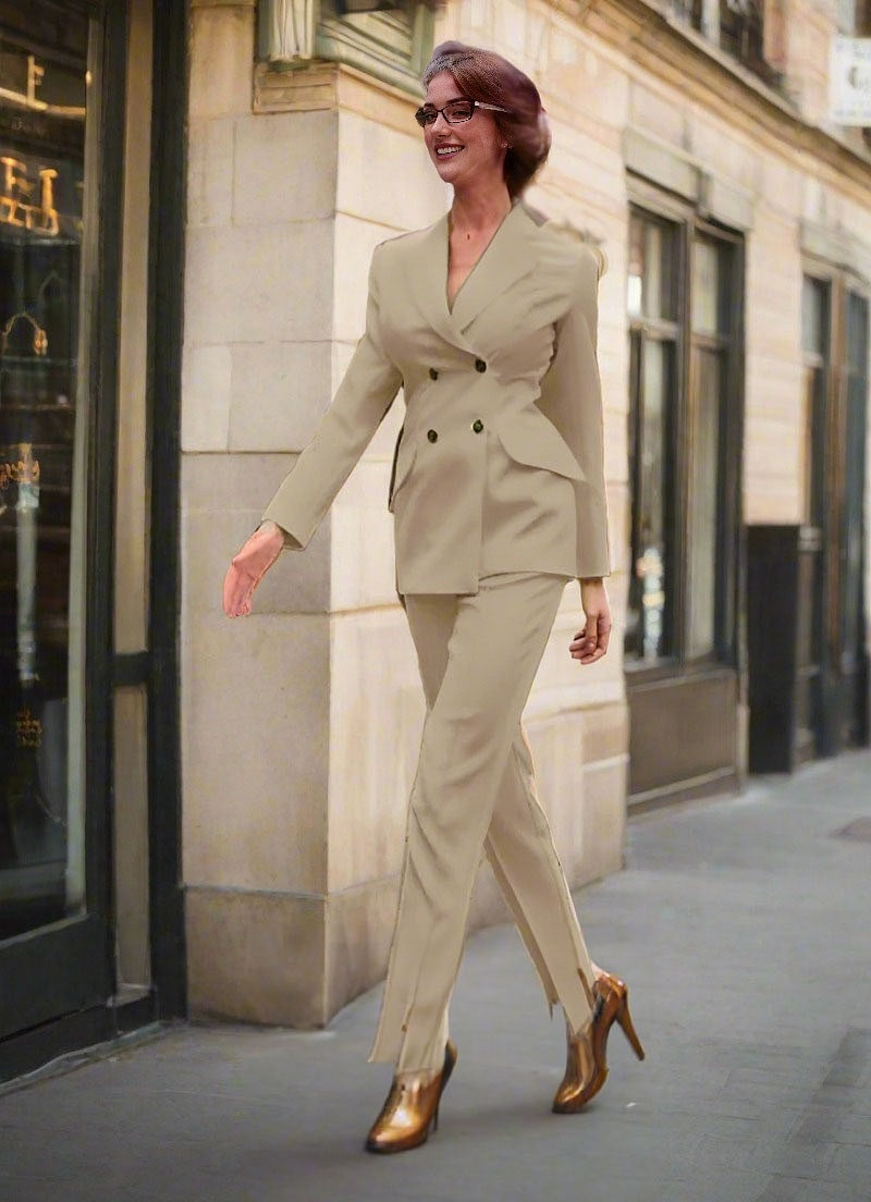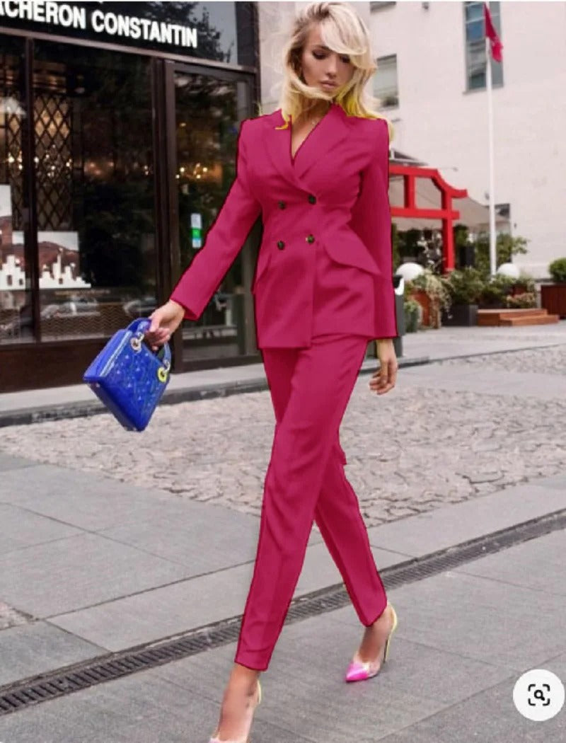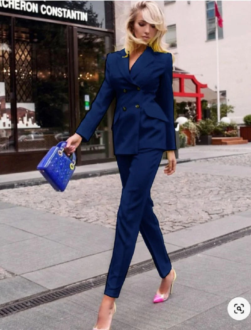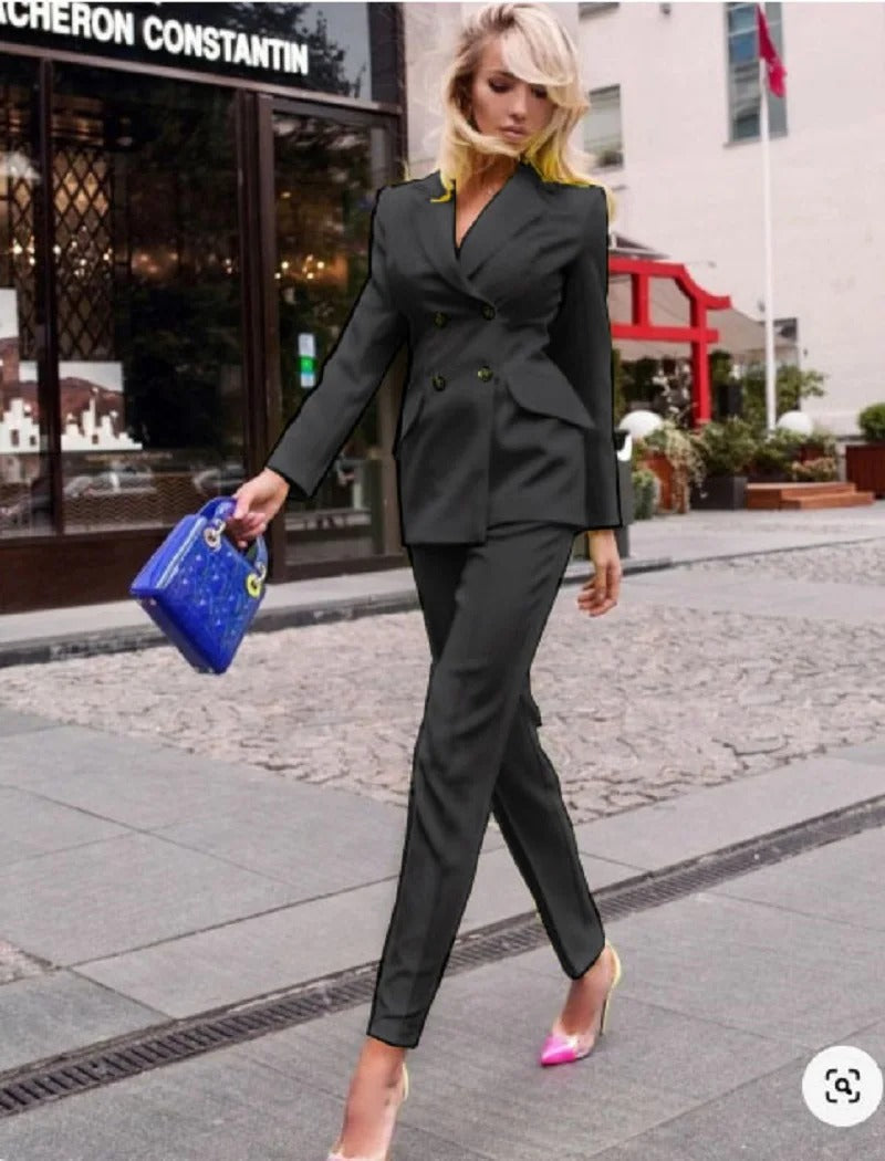 • Double-Breasted Blazer: This suit features a classic double-breasted blazer, giving it a timeless and authoritative look. The blazer boasts structured shoulders, a notched lapel, and elegant gold or silver-tone buttons for a touch of sophistication. The tailored cut offers a sleek and polished silhouette, making it ideal for any professional setting.
