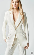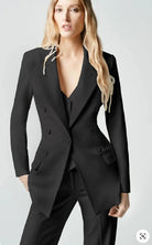 Double-Breast Blazer: The centerpiece of this suit, the double-breast blazer, features a flattering cut with structured shoulders and a slim fit, enhancing your silhouette. The tailored design includes notch lapels, a button-front closure, and functional pockets, blending timeless elegance with modern functionality.