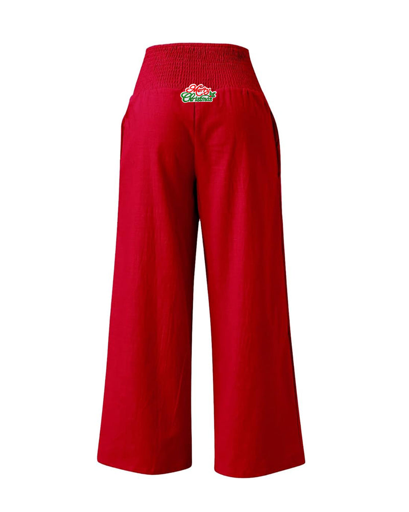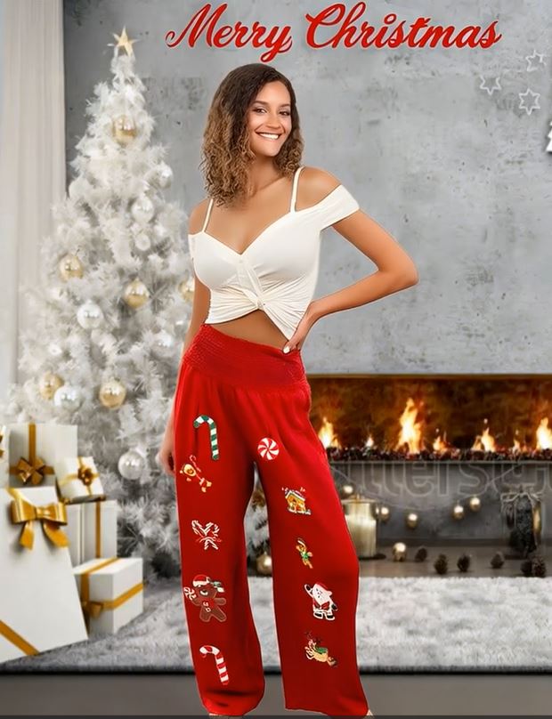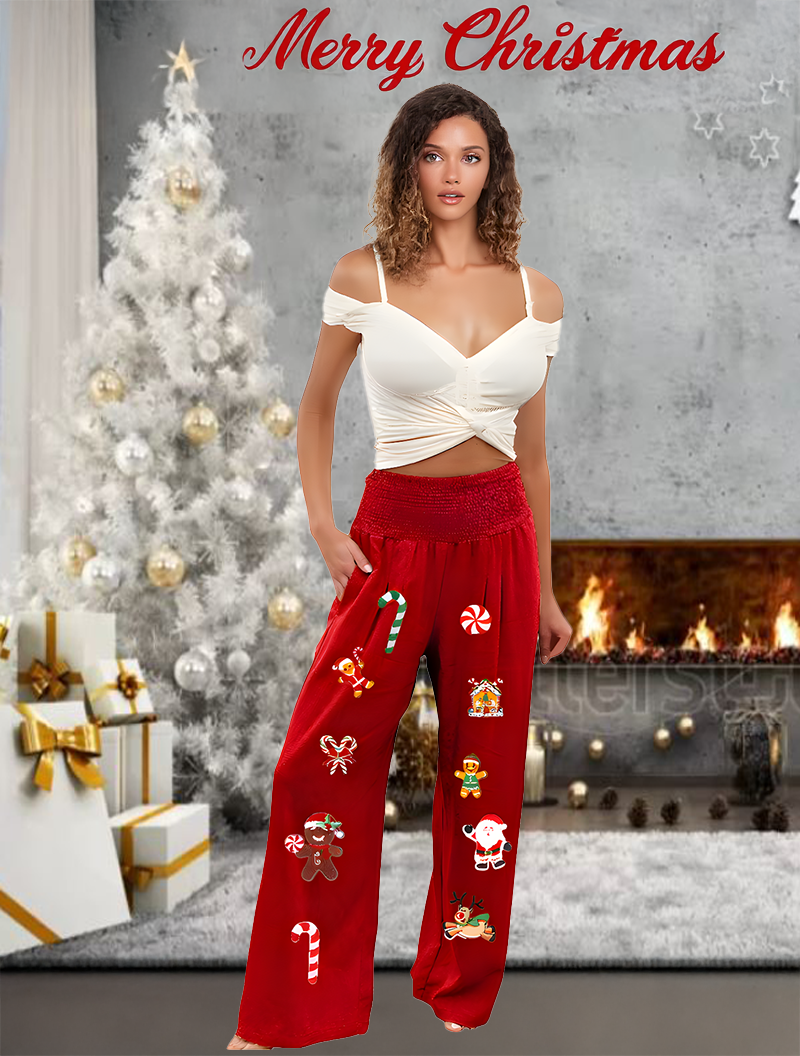 Ashore  Christmas festive red pants bring cheerful holiday spirit to any cozy look, featuring a collection of playful Christmas-themed embroidery patches scattered across the legs. The bright, saturated red fabric sets the perfect backdrop for charming motifs such as candy canes, gingerbread characters, Santa, reindeer, and sweet treats. Designed with a relaxed, wide-leg silhouette and a comfortable smocked waistband, the pants offer both ease and style, making them ideal for lounging, holiday gatherings, or festive photo moments. Their whimsical details and vibrant colors create a fun, joyful piece that instantly celebrates the season.